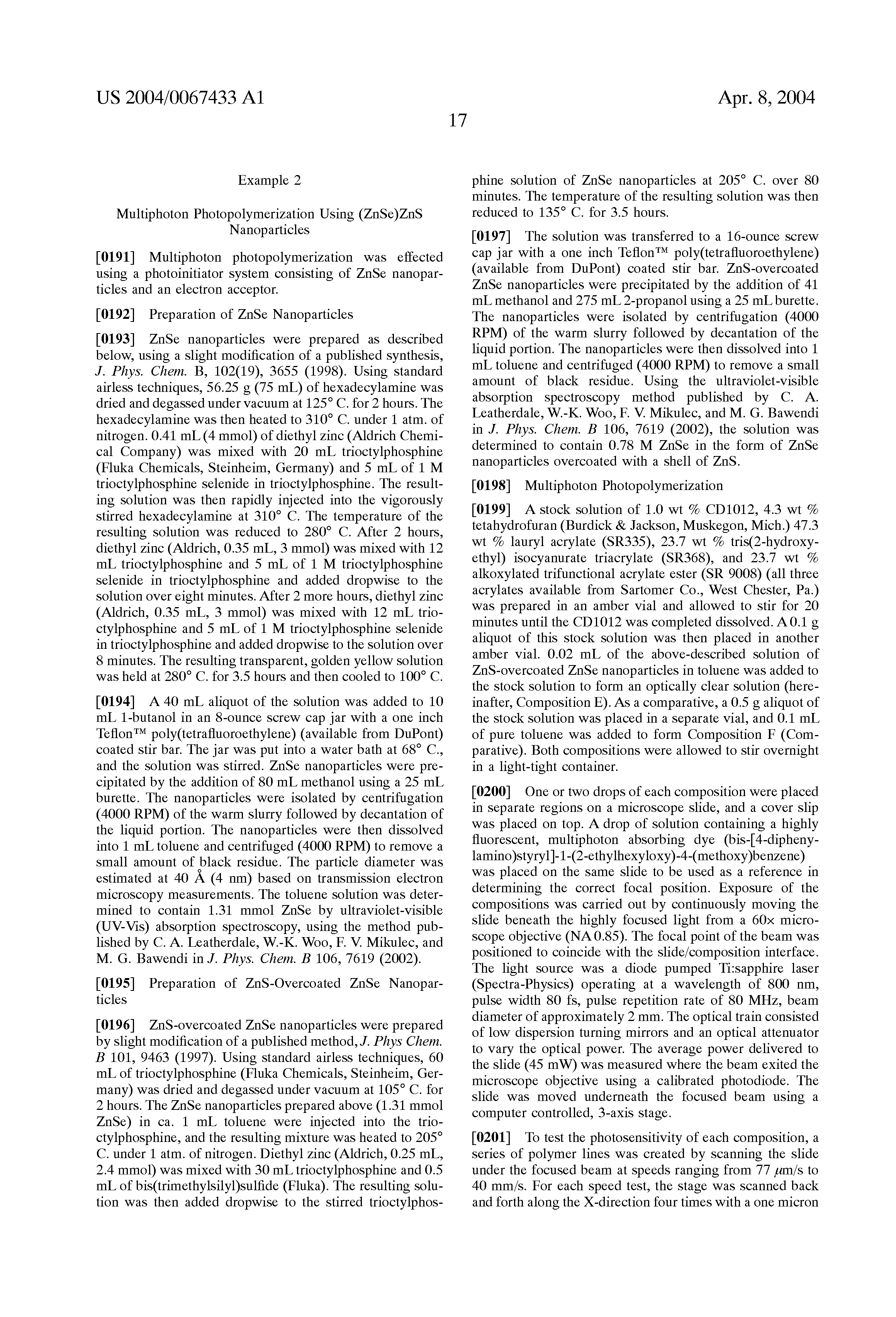 The components of the photoinitiator system are present in photochemically effective amounts (as defined above). Generally, the photoreactive composition can contain at least about 5% (preferably, at least about 10%; more preferably, at least about 20%) up to about 99.79% by weight of one or more reactive species; at least about 0.01% (preferably, at least about 0.1%; more preferably, at least about 0.2%) up to about 10% (preferably, up to about 5%; more preferably, up to about 2%) by weight of semiconductor nanoparticles; and at least about 0.1% (preferably, at least about 0.2%; more preferably, at least about 0.3%) up to about 15% (preferably, up to about 10%; more preferably, up to about 5%) of the composition that is capable of interacting with the semiconductor nanoparticles to form at least one reaction-initiating species.
