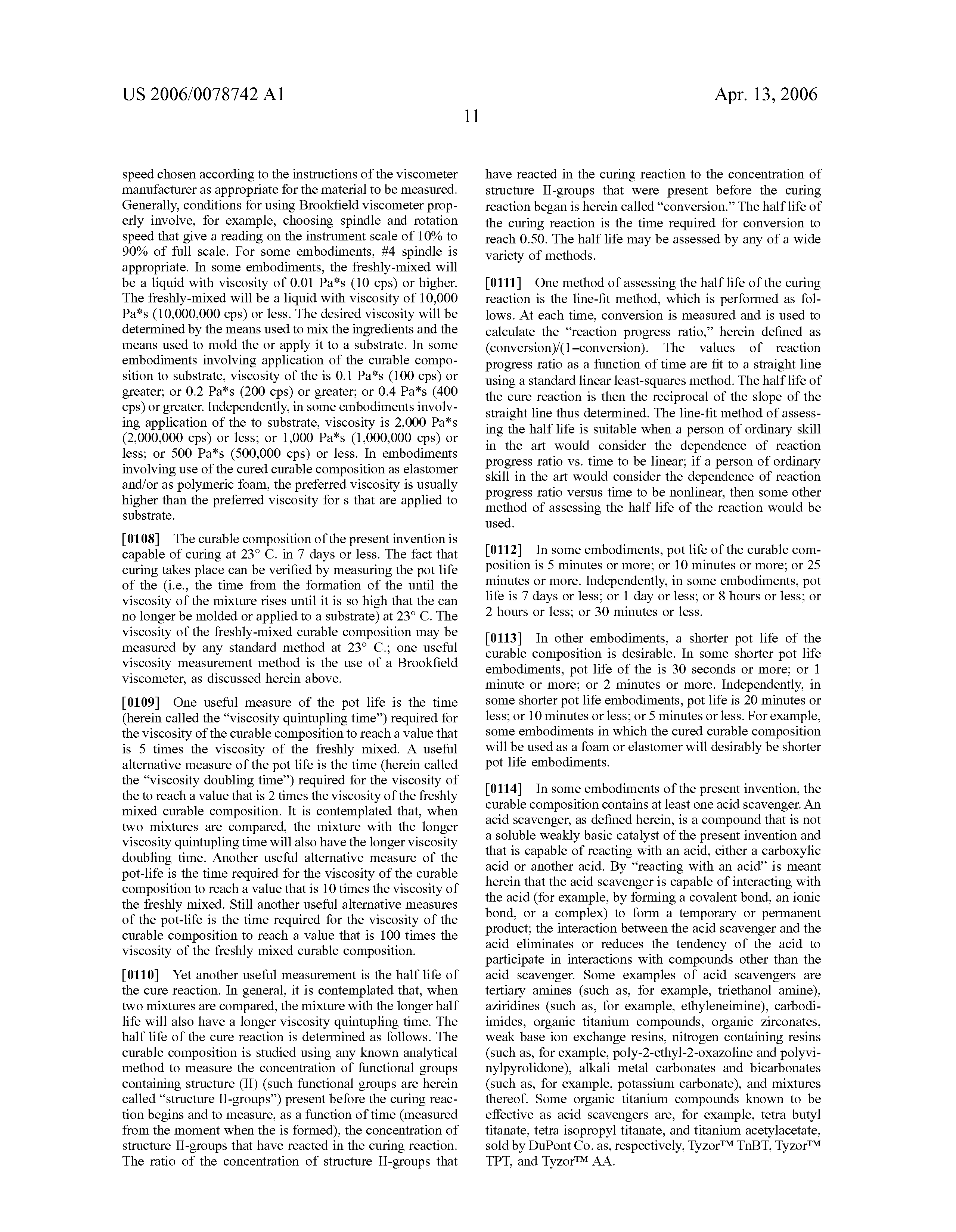As used herein, the time required for viscosity to increase to a level that is not useful is referred to as “pot life”. The compositions of the invention have long pot lives as compared to conventional compositions known in the art. The time required for the adhesive strength to reach an acceptable level is referred to as “cure time”. The compositions of the invention have rapid cure times as compared to conventional compositions known in the art. The term “reaction promoter” refers to any conventional physical promoters, including but not limited to for example, thermal and actinic radiation, and chemical promoters including but not limited to for example, reaction promoters selected from one or more of a catalyst, a co-catalyst and an acid scavenger. The inventors have also discovered certain substrates which are themselves reaction promoters. Suitable chemical promoters include but are not limited to for example, Polyethylene imine, amine terminated polyamides, amino silanes, and base neutralized latices.