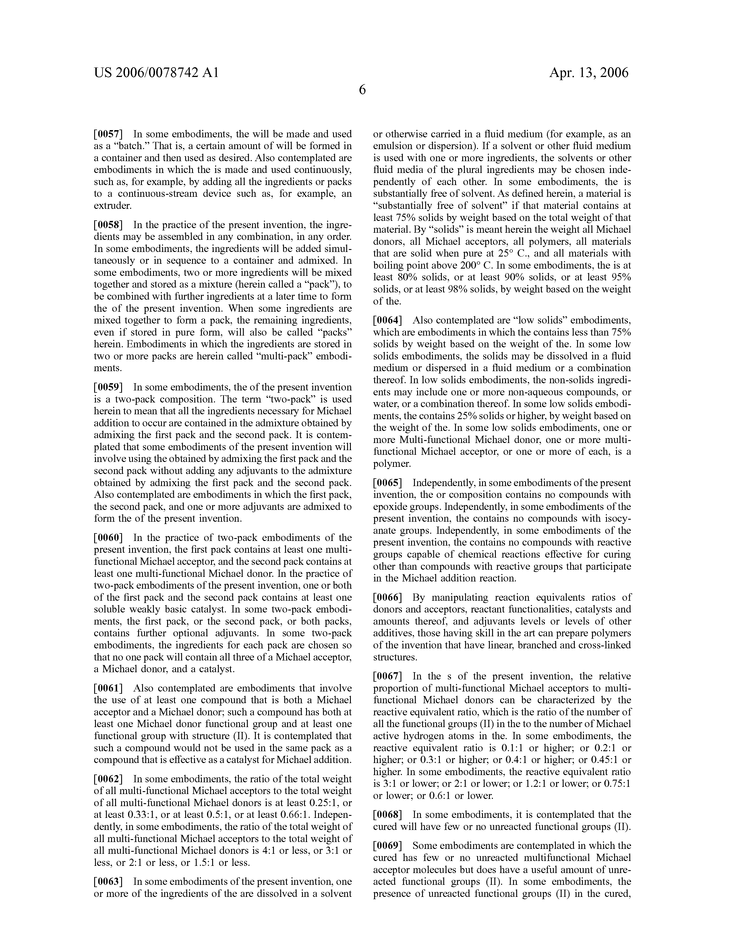 In some embodiments, a suitable multifunctional Michael acceptor, as supplied by a manufacturer, contains at least one salt that is suitable as a soluble weakly basic catalyst. Such multifunctional Michael acceptors are contemplated to be used in the practice of the present invention. In some cases, the amount of salt that is present in the multifunctional Michael acceptor, as supplied by the manufacturer, is low enough that it would be desirable, in the practice of the present invention, to use an additional amount of soluble weakly basic catalyst, which may be the same or different from the one already present in the multifunctional Michael acceptor.