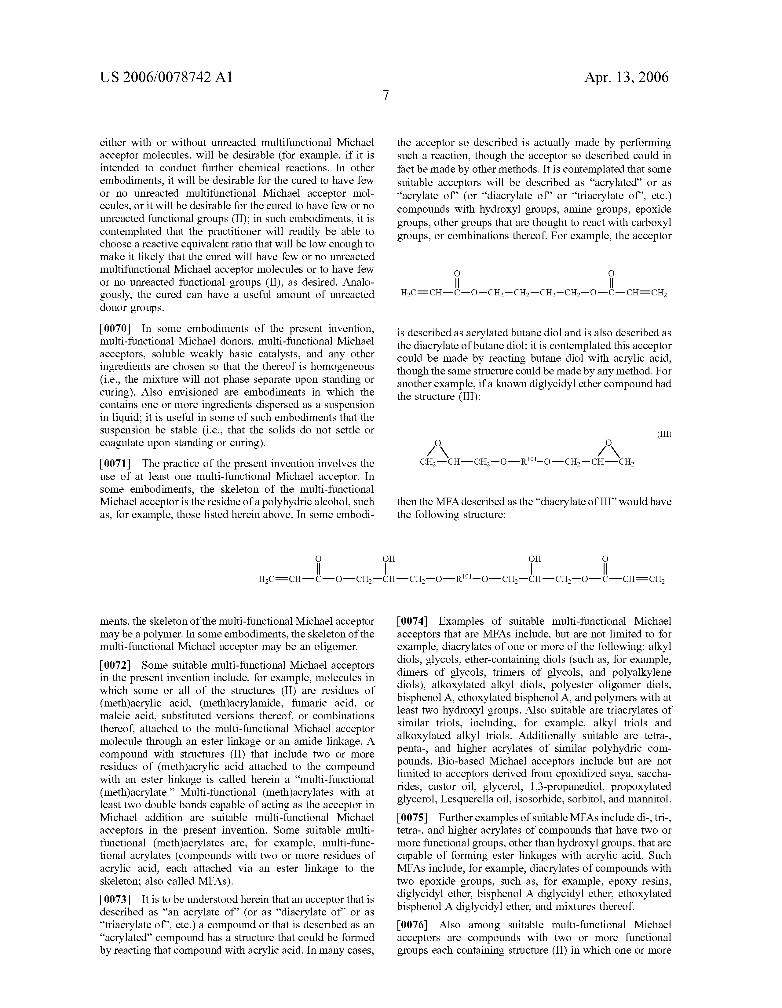A “Michael donor,” as used herein, is a compound with at least one Michael donor functional group, which is a functional group containing at least one Michael active hydrogen atom, which is a hydrogen atom attached to a carbon atom that is located between two electron-withdrawing groups such as C═O and/or C≡N. Examples of Michael donor functional groups are malonate esters, acetoacetate esters, malonamides, and acetoacetamides (in which the Michael active hydrogens are attached to the carbon atom between two carbonyl groups); and cyanoacetate esters and cyanoacetamides (in which the Michael active hydrogens are attached to the carbon atom between a carbonyl group and a cyano group). A compound with two or more Michael active hydrogen atoms is known herein as a multi-functional Michael donor. A Michael donor may have one, two, three, or more separate functional groups that each contain one or more Michael active hydrogen atoms. The total number of Michael active hydrogen atoms on the molecule is the functionality of the Michael donor. As used herein, the “backbone” or “skeleton” of the Michael donor is the portion of the donor molecule other than the functional group containing the Michael active hydrogen atom(s).