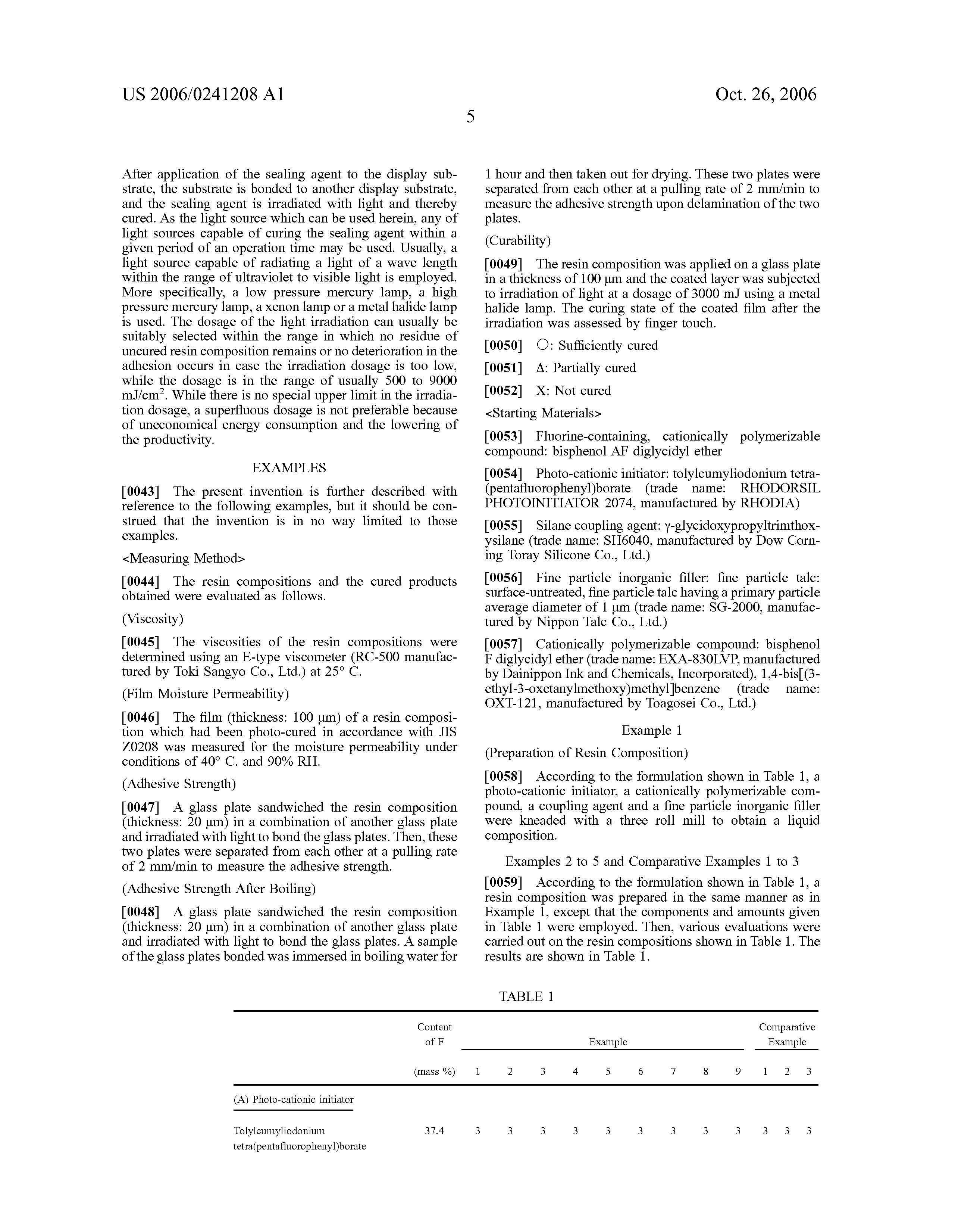 To solve such problems as mentioned above, an attempt to develop a photo-curable sealing agent capable of undergoing fast curing at low temperatures has been made. The photo-curable sealing agents are roughly classified as photo-radically curable sealing agents or cationically photo-curable sealing agents. The photo-radically curable sealing agent has an advantage that various acrylate monomers or oligomers are employable, but has high volume shrinkage and low adhesive force upon curing. Thus, in order to decrease the volume shrinkage, the number of the functional groups per unit weight of the sealing agent must be small, and thus various physical properties become limited. On the other hand, the cationically photo-curable sealing agent has lower curing shrinkage and higher adhesive force than those of the photo-radically curable sealing agent since it uses a ring-opening polymerization, nevertheless, further improvement has been required with respect to practical use. In the preparation of the flat panel display, in order to enhance the production yield, a process wherein several panels are formed and adhered onto a large glass substrate, and then the glass substrate is separated therefrom is provided. In this process, high stress is applied on the glass substrate, and hence there is a problem that in the case where the sealing agent has insufficient adhesive strength, delamination may occur. Further, sealing the organic EL element requires high moisture permeation resistance, as well as surface adhesion to the various members used in the organic EL element for preventing water from penetrating into the panel from the adhered surface.