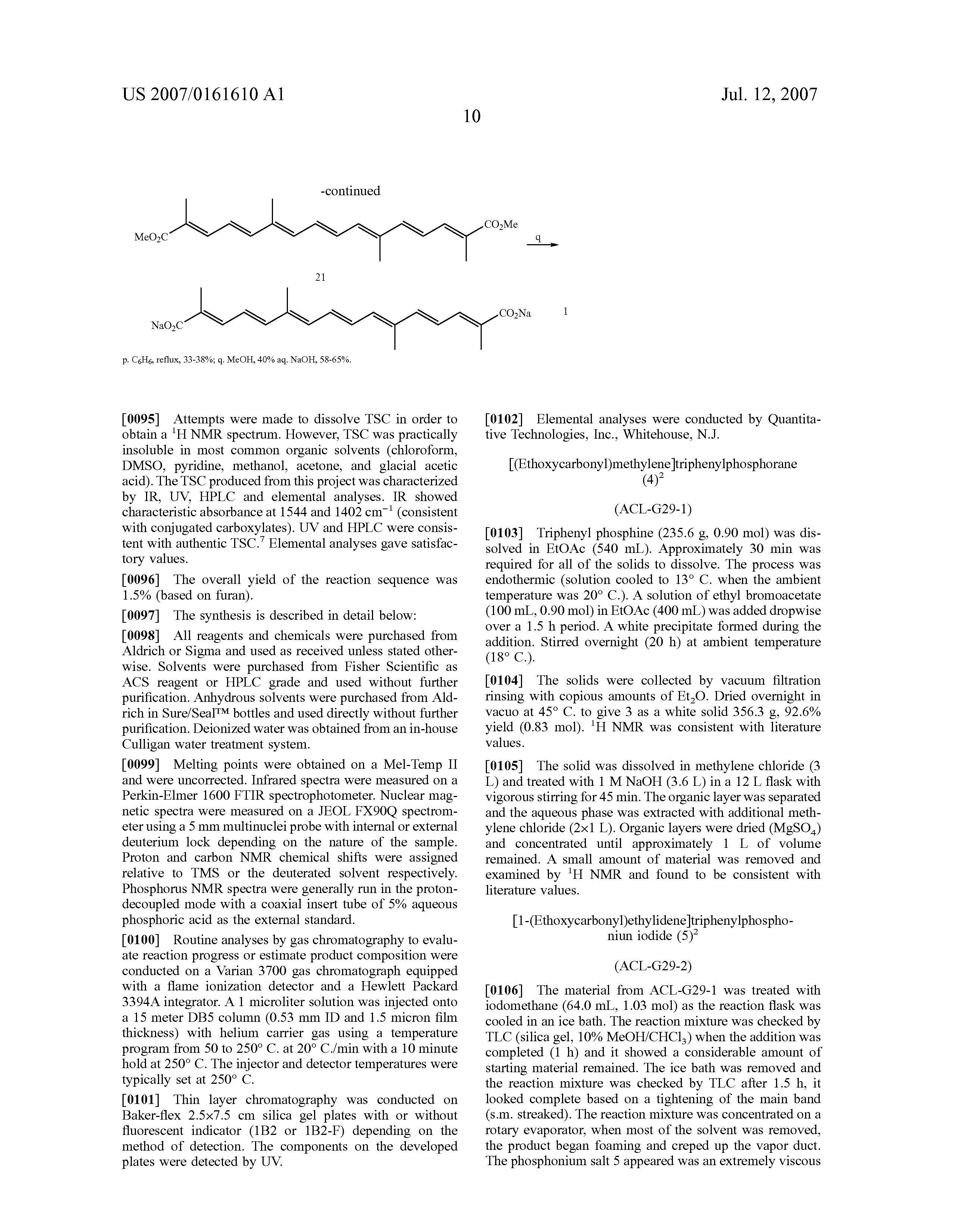 The resulting slurry was cooled in an ice bath for 40 minutes, suction filtered, washed with benzene and sucked dry to melt the frozen benzene to give a red solid; 2.1 g. TLC analvsis showed a single, yellow spot. This solid was dried in a vacuum oven at 40-45° C. for 70 minutes; 1.85 g (40.5% yield). uncorrected mp=210-213° C. lit3 mp=214-216° C. Proton NMR was similar to the previous spectrum of dimethyl crocetin on 90 MHz instrument. Carbon NMR showed all 11 unique carbon signals with the correct chemical shift for the desired dimethyl ester with one minor impurity signal that may be residual benzene. Electrospray mass spectrum suggested decomposition and recombination of fragments.
