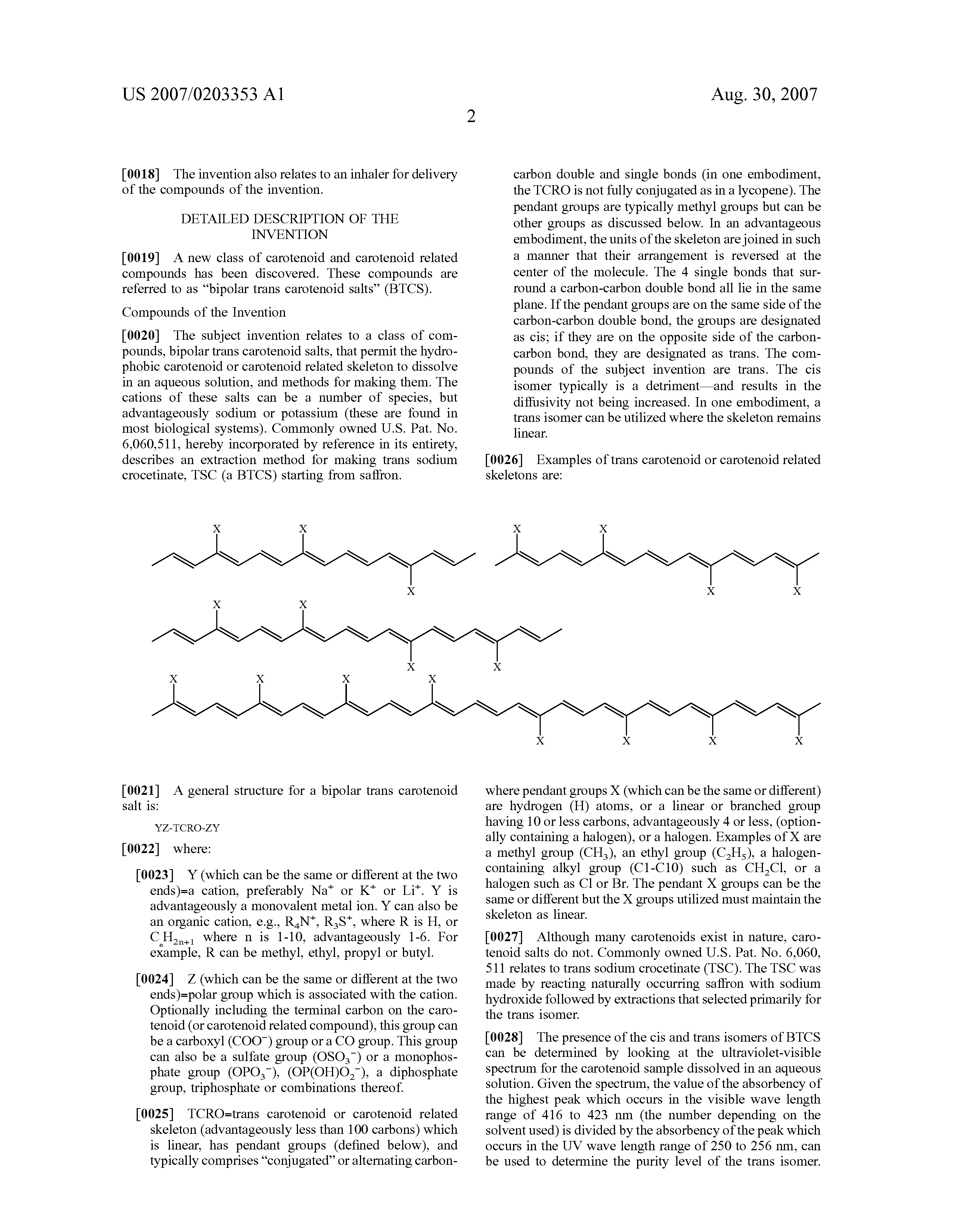 U.S. Pat. No. 6,060,511 relates to trans sodium crocetinate (TSC) and its uses. The TSC is made by reacting naturally occurring saffron with sodium hydroxide followed by extractions.