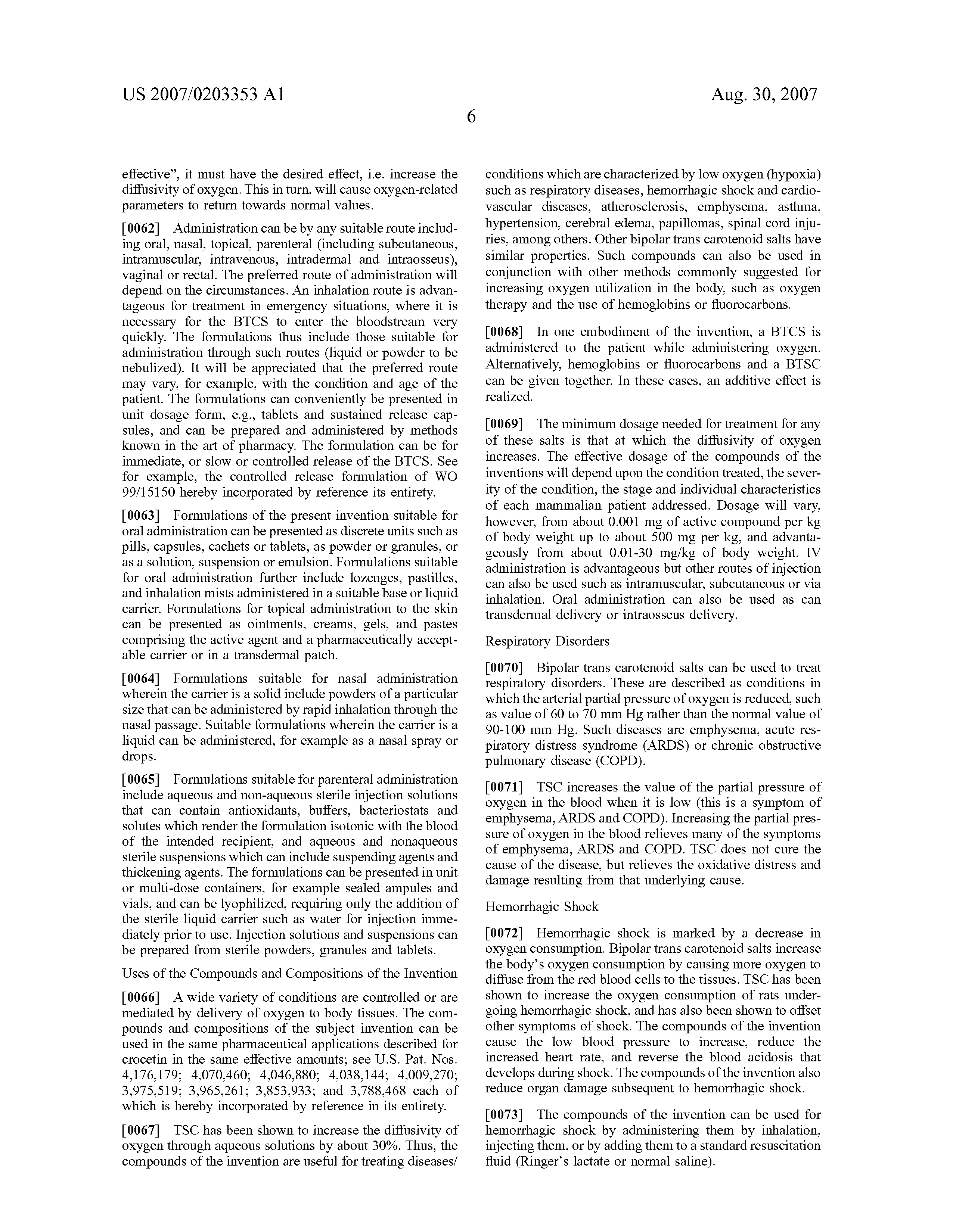 In Roy et al, Shock 10, 213-7. (1998), hemorrhaged rats (55% blood volume) were given a bolus of trans sodium crocetinate (TSC) after 10 minutes, followed by saline after another 30 minutes. All of the TSC-treated animals lived, while all controls died. Whole-body oxygen consumption increased in the TSC group, reaching 75% of normal resting value after about 15 minutes.