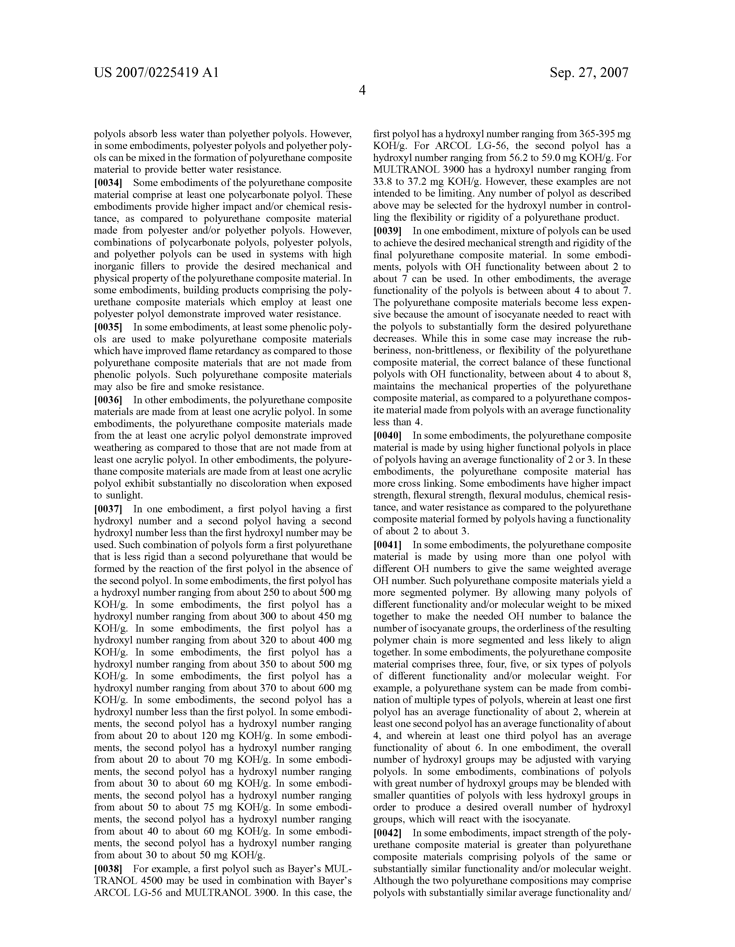 As is well known to persons having ordinary skill in the art, polyurethane materials may also contain other polymeric components by virtue of side reactions of the polyol or isocyanate monomers. For example, a polyisocyanurate may be formed by the reaction of optionally added water and isocyanate. In addition, polyurea polymers may also be formed. In some embodiments, such additional polymer resins may have an effect on the overall characteristics of the polyurethane composite material.