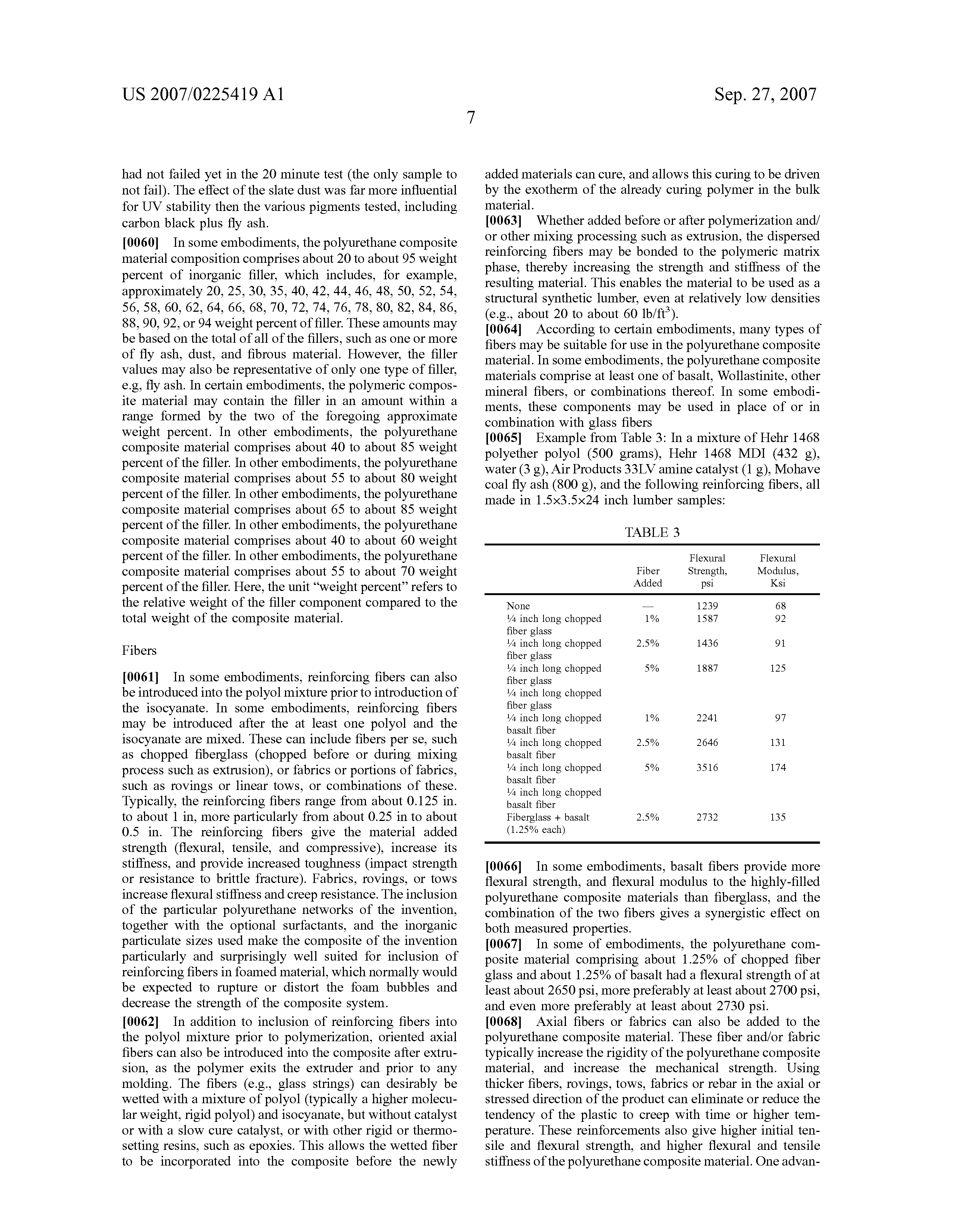 For example, a multi-zone extruder can be used, with polyols and additives introduced into the first zone, inorganic particulates introduced in the second zone, and chopped fibers, isocyanate, and pigments introduced in the fifth zone. A twin screw, co-rotating, extruder (e.g. 100 mm diameter, although the diameter can be varied substantially) can be used, with only water cooling (to maintain substantially near room temperature), and without extruder vacuum (except for ash dust). Liquid materials can be pumped into the extruder, while solids can be added by suitable hopper/screw feeder arrangements. Internal pressure build up in such an exemplary arrangement is not significant.