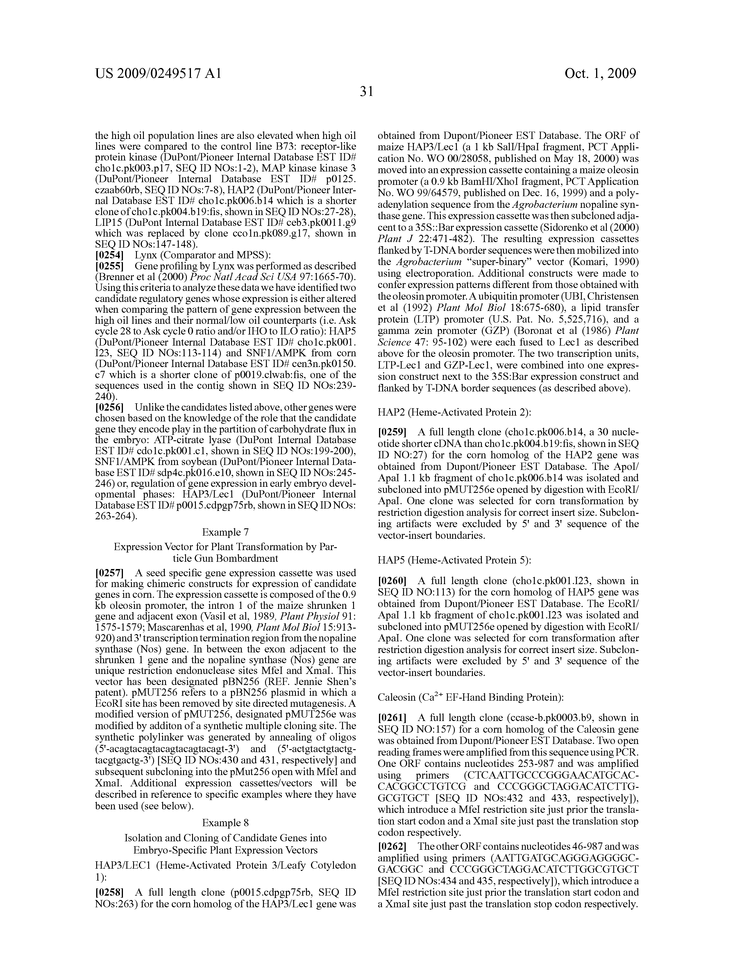- (iv) a nucleic acid sequence encoding a plant Hap3/Lec1 transcription factor having at least 60% identity based on the Clustal method of alignment when compared to a second polypeptide selected from the group consisting of even SEQ ID NOs: from 260 to 278, and SEQ ID NOs:411 and 412;