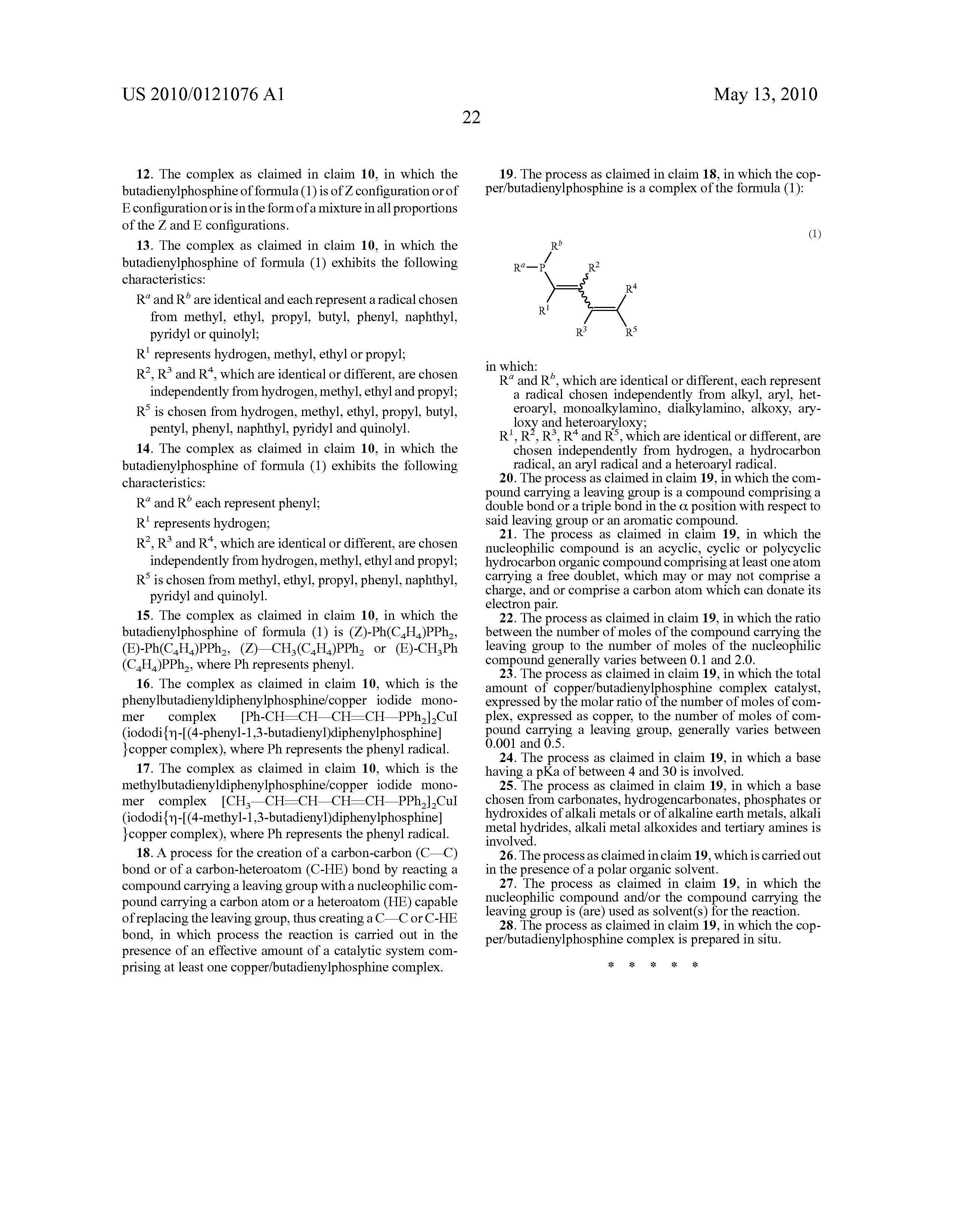 The Pho-Bu/Cu complexes defined above can be prepared according to conventional techniques known to a person skilled in the art. For example, the Pho-Bu/Cu complexes can be prepared by bringing at least one butadienylphosphine, in particular of formula (1) defined supra, into contact with metallic copper or a copper (copper(I) or copper(II)) derivative, for example a copper halide, such as cupric or cuprous iodide, bromide or chloride, or other derivatives, in particular organocopper compounds, for example copper acetylacetonate.