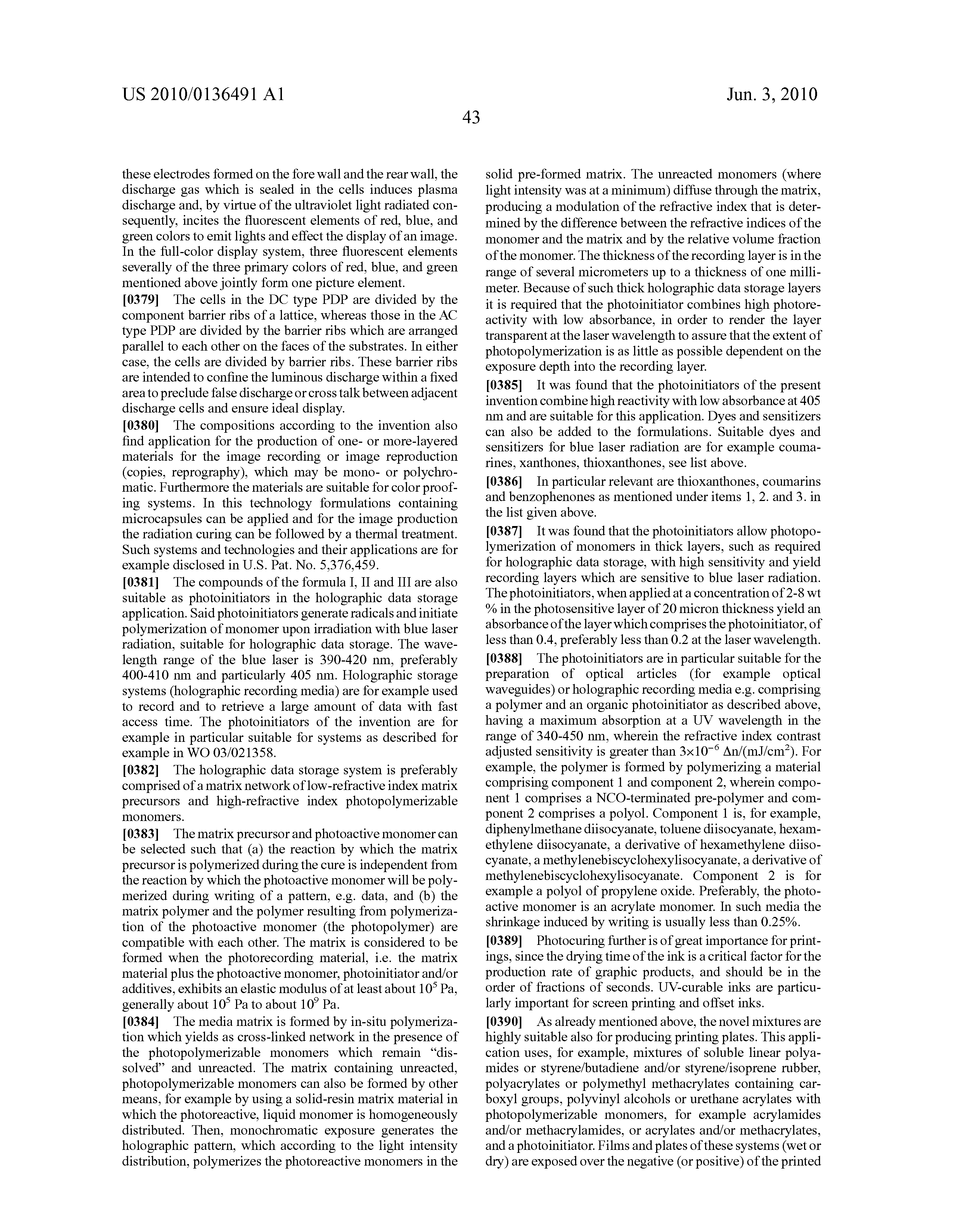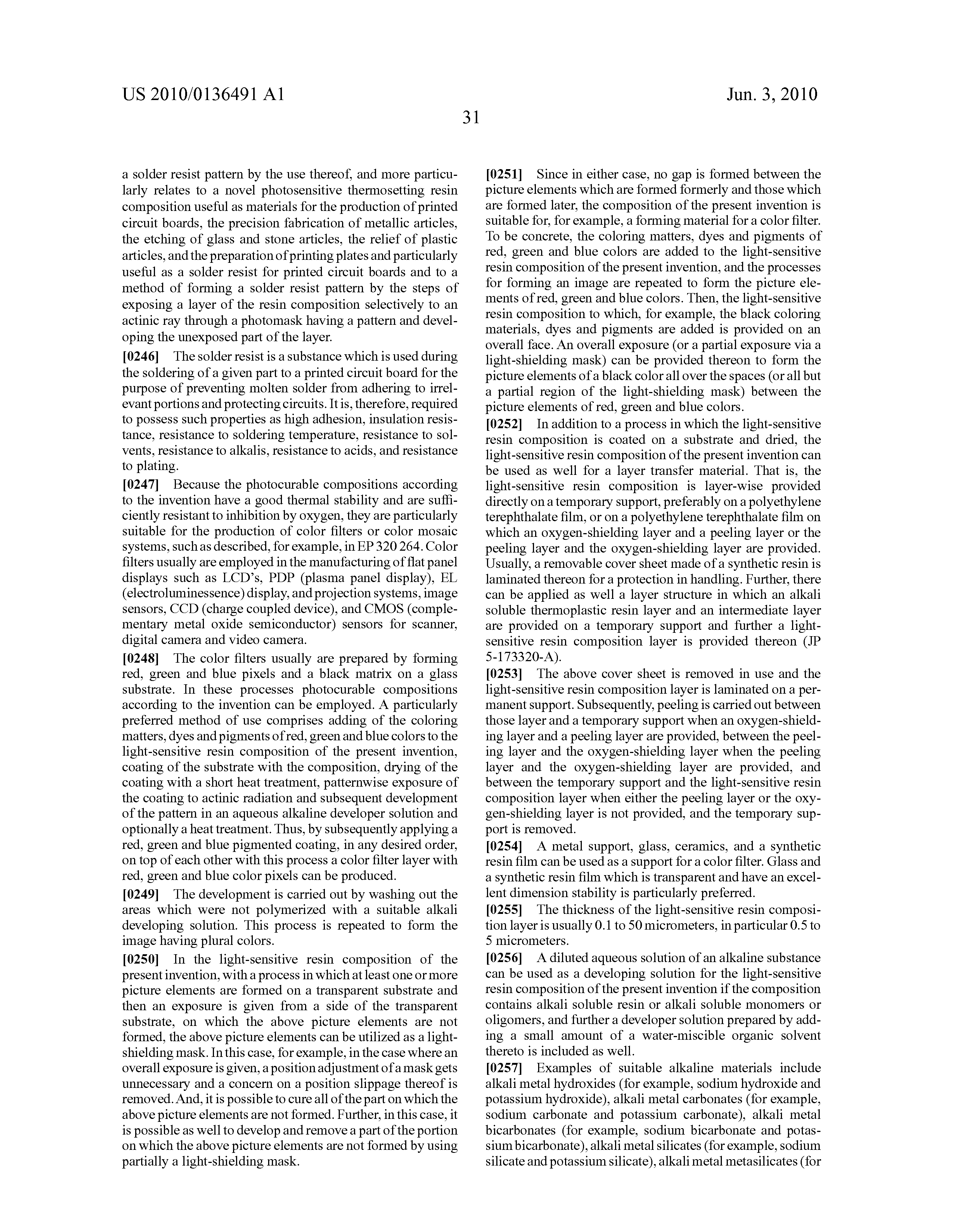 A black color dispersion is prepared by mixing the above components and dispersing them by using a Paint conditioner (SKANDEX) for 1.5 hours. The binder polymer solution (48.0 parts by weight) described in the above example is mixed with the dispersion by the Paint conditioner and further DPHA (7.0 parts by weight, dipentaerythritol hexaacrylate, provided by UCB Chemicals) and PGMEA (46.7 parts by weight) are added. The photoinitiators to be tested are added to the resist composition. The black matrix resists thus prepared are applied on a glass substrate by means of a spin coater. The coated substrates are dried at 80° C. for 10 min. The thickness of the dry film is approximately 1.1 μm. A standardized test negative mask with 9 steps of different optical density (EIA GRAY SCALE, EDMUND SCIENTIFIC) is placed on the resist. Exposure is carried out using a 250W super high pressure mercury lamp (USHIO, USH-250BY) at a distance of 15 cm. A total exposure dose measured by an optical power meter (ORC UV Light Measure Model UV-MO2 with UV-35 detector) on the test negative mask is 300 mJ/cm2. After exposure, the exposed film is developed with an alkaline solution (5% aqueous solution of DL-A4, Yokohama Yushi) at 28° C. by using a spray type developer (AD-1200, Takizawa Sangyo). The sensitivity of the photoinitiator is characterized by indicating the highest number of the step remained (i.e. polymerized) after developing. The higher the number of steps, the more sensitive is the photoinitiator tested. The results are listed in the following table 2.