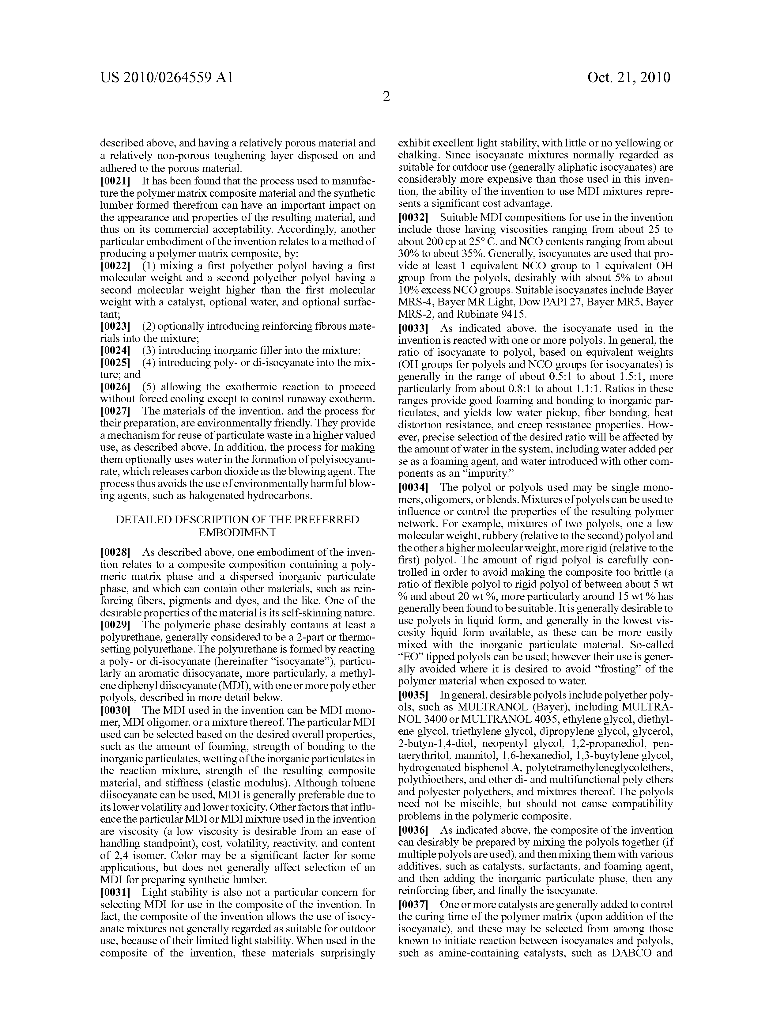The MDI used in the invention can be MDI monomer, MDI oligomer, or a mixture thereof. The particular MDI used can be selected based on the desired overall properties, such as the amount of foaming, strength of bonding to the inorganic particulates, wetting of the inorganic particulates in the reaction mixture, strength of the resulting composite material, and stiffness (elastic modulus). Although toluene diisocyanate can be used, MDI is generally preferable due to its lower volatility and lower toxicity. Other factors that influence the particular MDI or MDI mixture used in the invention are viscosity (a low viscosity is desirable from an ease of handling standpoint), cost, volatility, reactivity, and content of 2,4 isomer. Color may be a significant factor for some applications, but does not generally affect selection of an MDI for preparing synthetic lumber.