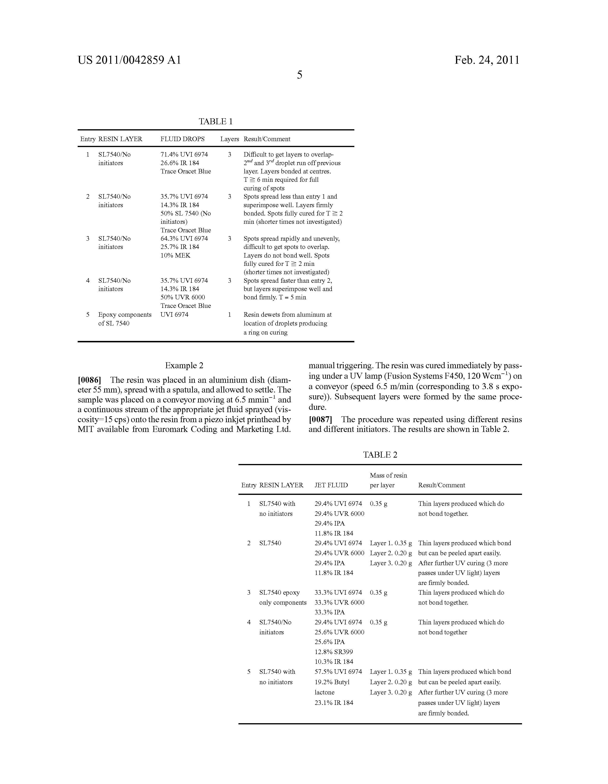 The resin was placed in an aluminium dish (diameter 55 mm), spread with a spatula, and allowed to settle. The sample was placed on a conveyor moving at 6.5 mmin−1 and a continuous stream of the appropriate jet fluid sprayed (viscosity=15 cps) onto the resin from a piezo inkjet printhead by MIT available from Euromark Coding and Marketing Ltd. manual triggering. The resin was cured immediately by passing under a UV lamp (Fusion Systems F450, 120 Wcm−1) on a conveyor (speed 6.5 m/min (corresponding to 3.8 s exposure)). Subsequent layers were formed by the same procedure.