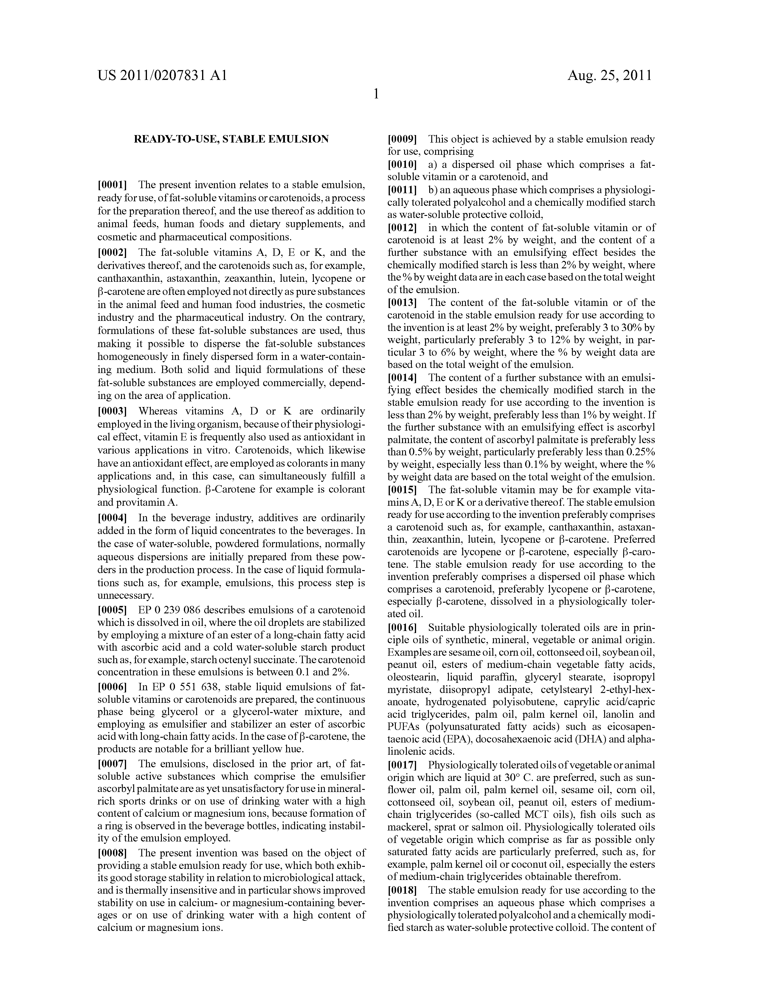 The content of a further substance with an emulsifying effect besides the chemically modified starch in the stable emulsion ready for use according to the invention is less than 2% by weight, preferably less than 1% by weight. If the further substance with an emulsifying effect is ascorbyl palmitate, the content of ascorbyl palmitate is preferably less than 0.5% by weight, particularly preferably less than 0.25% by weight, especially less than 0.1% by weight, where the % by weight data are based on the total weight of the emulsion.