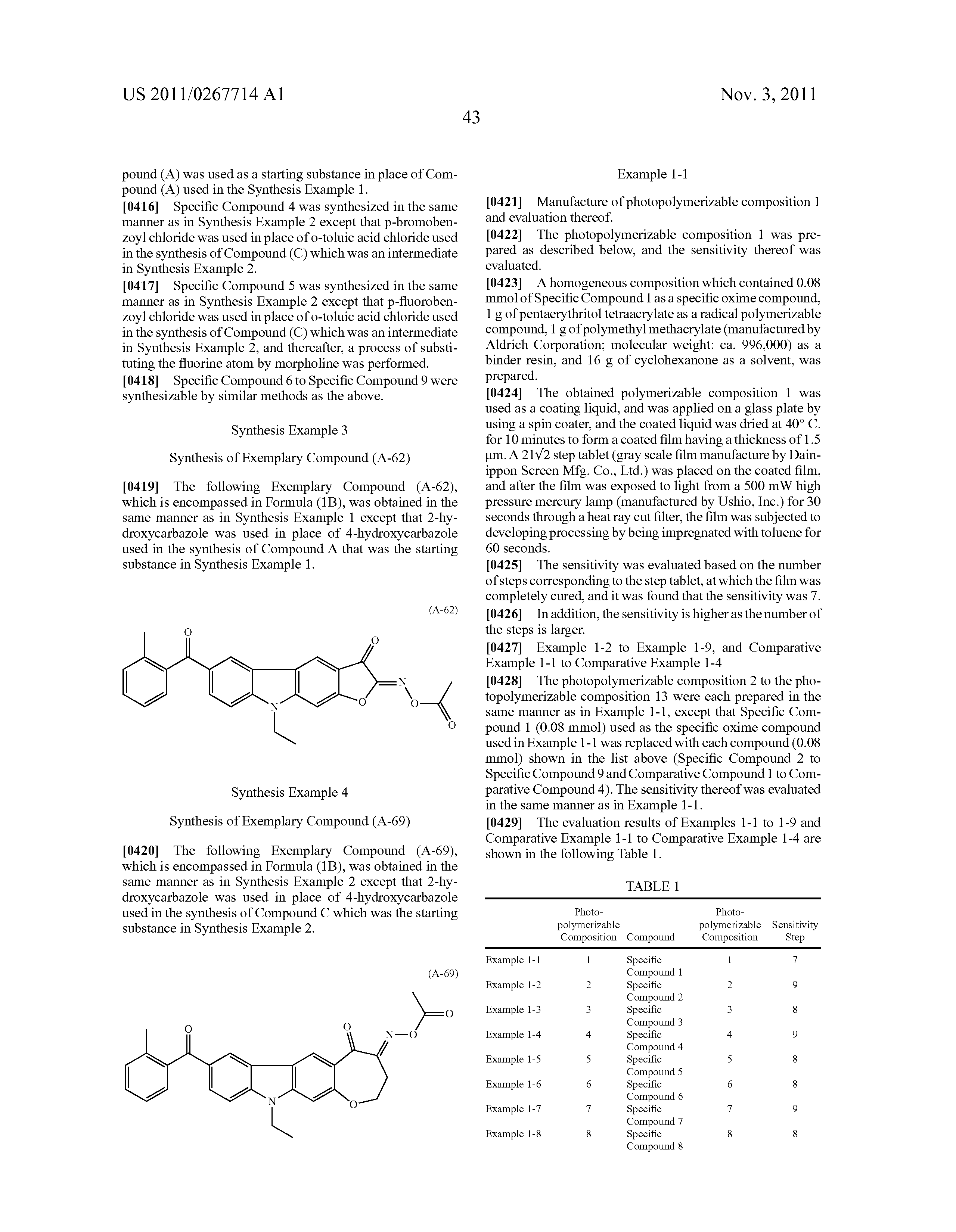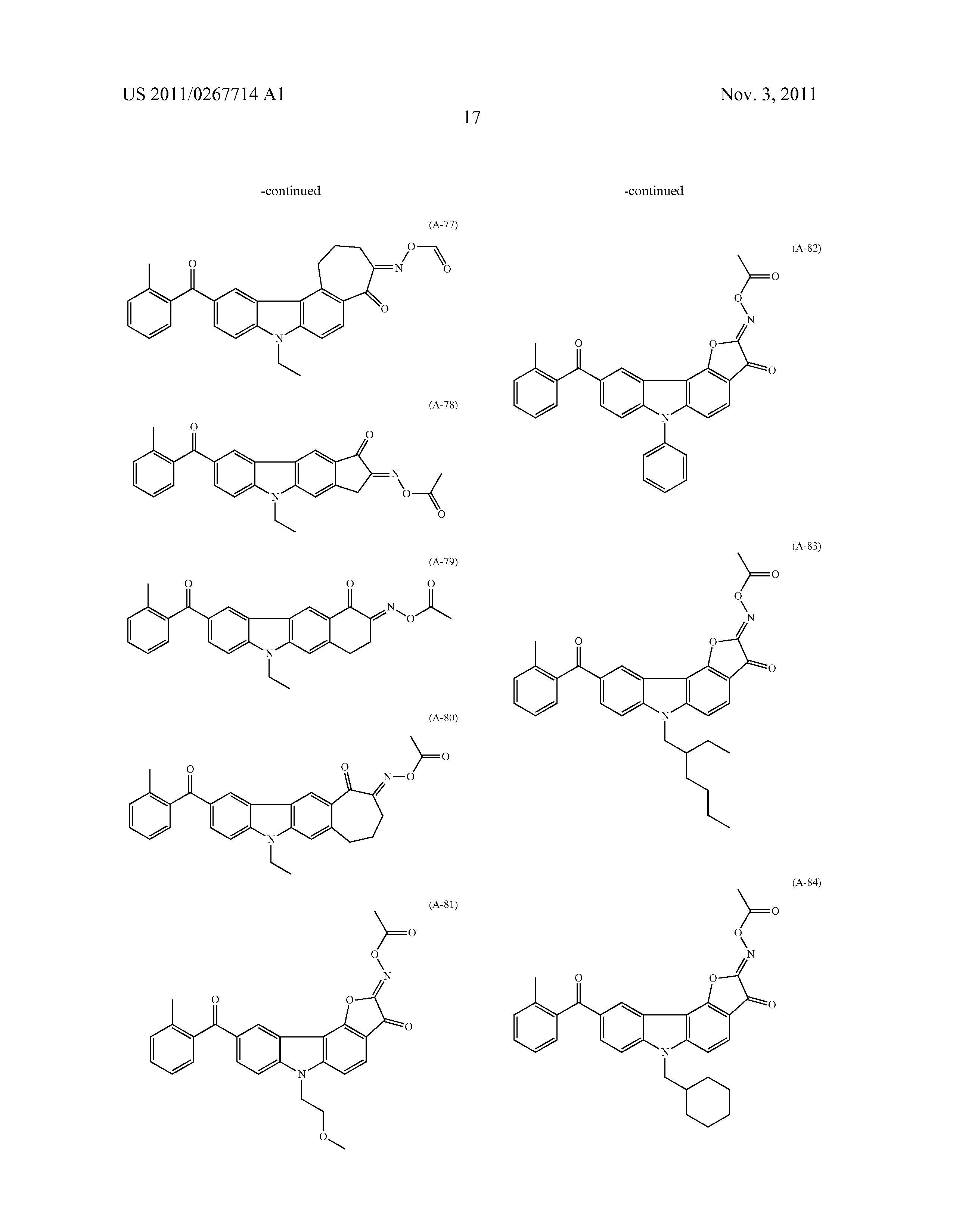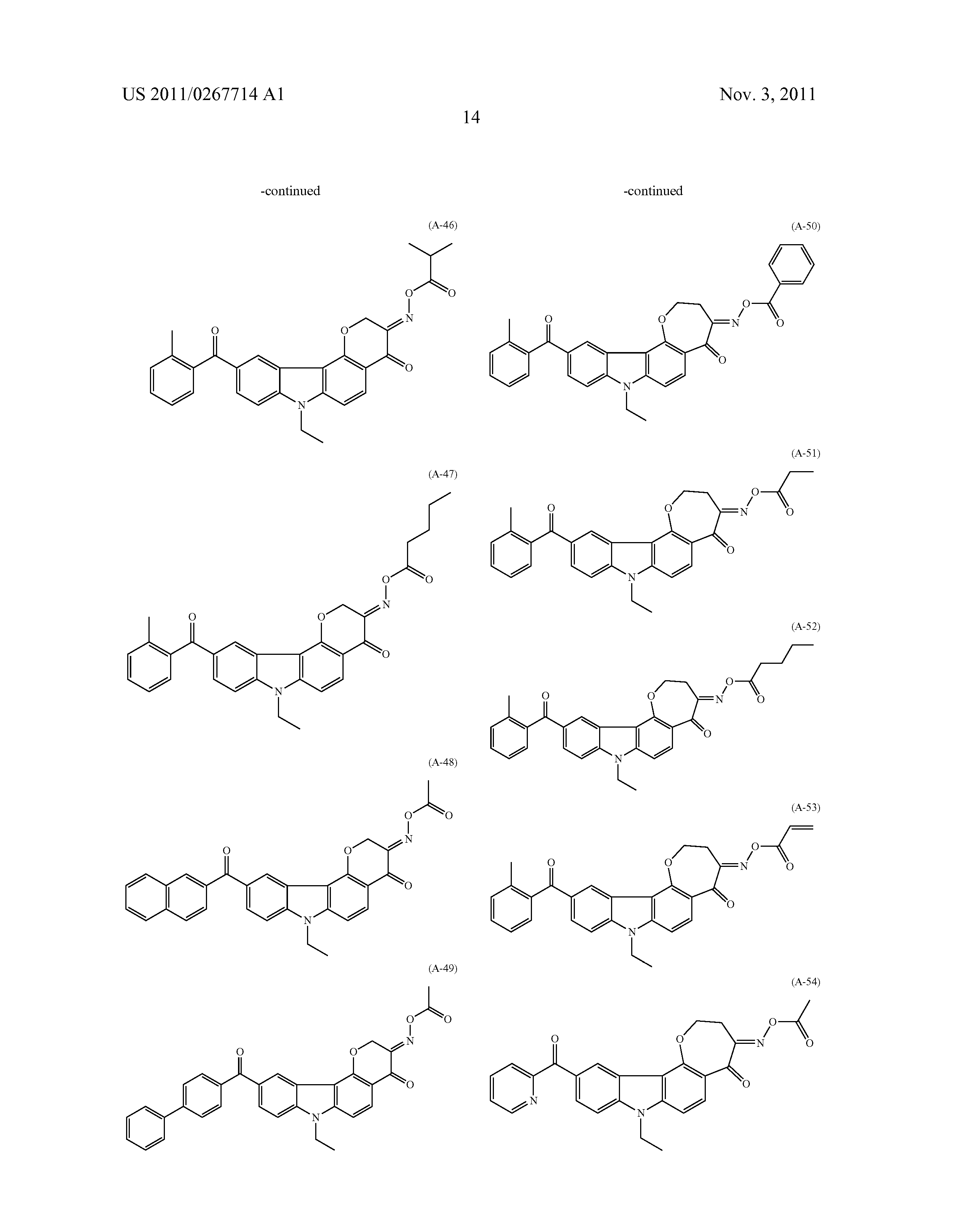 For this reason, as photopolymerization initiators used for the photopolymerizable composition, oxime ester derivatives are proposed (for example, refer to U.S. Pat. No. 4,255,513, U.S. Pat. No. 4,590,145, Japanese Patent Application Laid-Open (JP-A) No. 2000-80068, JP-A No. 2001-233842, JP-A No. 2006-342166, and JP-A No. 2007-231000). However, since these known oxime ester compounds have low light absorptivity in the wavelength of 365 nm and/or the wavelength of 405 nm, they are still unsatisfactory in view of sensitivity.