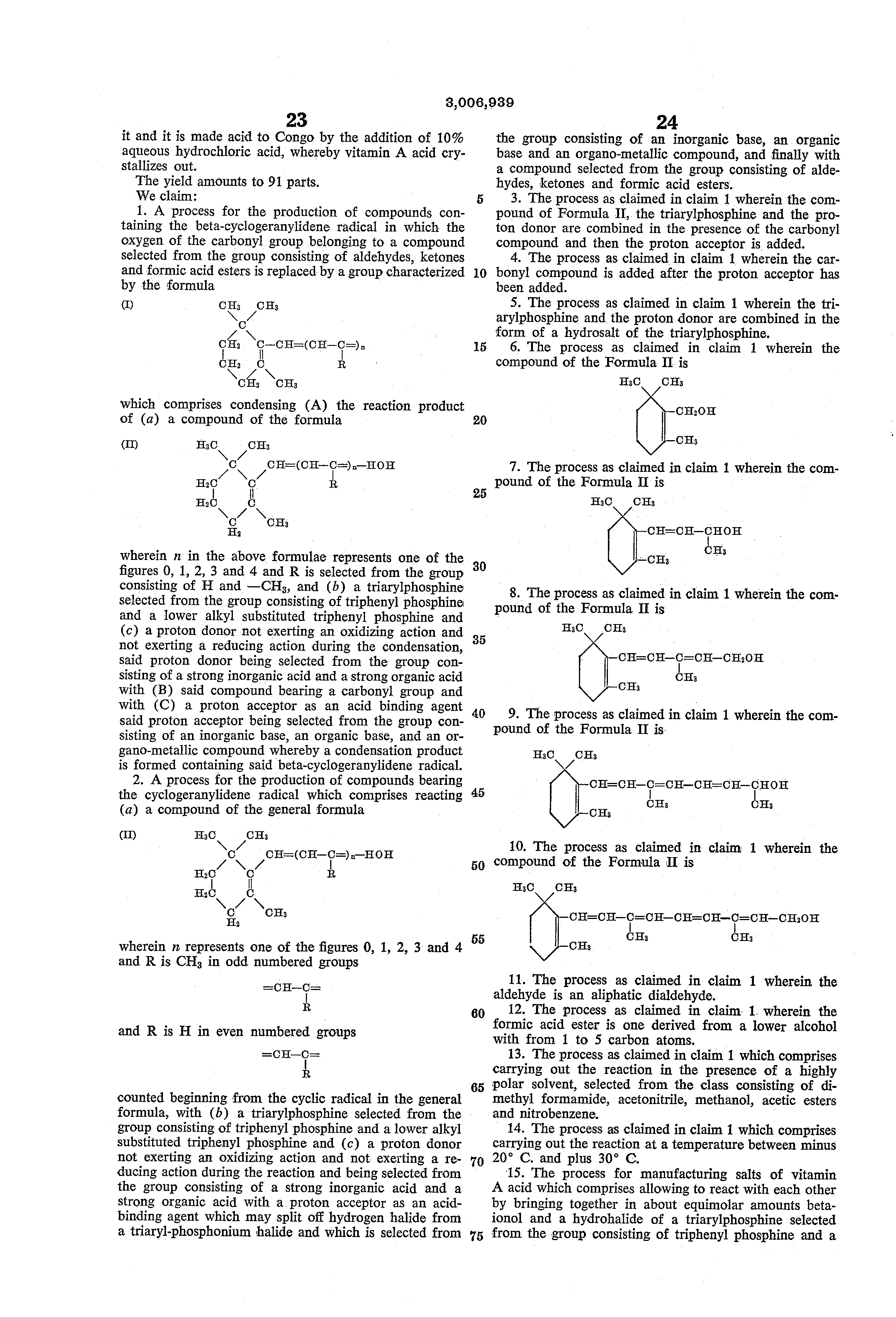 Example 33 108 parts of beta-ionol and parts of triphenylphosphine hydrochloride are dissolved in 150 parts of dimethylformamide and stirred for 6 hours at room temperature. Then 62.5 parts of 4-methyl-hexadiene-(2.4)- al-(1)-acid-(6) dissolved in 50 parts of ethanolare added and, while cooling to --10 C., 80 parts of potassium hydroxide dissolved in 200 parts of ethanol are dripped in fairly rapidly. The reaction is strongly exothermic and cooling is applied so that 15 C. is not exceeded. The whole isthen stirred for another 30 minutes at room temperature and alcoholic hydrochloric acid is added until the reaction is neutral; then a few drops of ammonia are added and the ethanol evaporated off in vacuo. The pasty residue has 300 parts of isopropanol added to (1) CH3 CH CH: (1% i which comprises condensing (A) the reaction product of (a) a compound of the formula (II) H30 CHa C\ /CH=(CH(IJ=)11HOH H2? 1CI R H2C\ /C\ C CH3 z wherein n in the above formulae represents one of the figures 0, l, 2, 3 and 4 and R is selected from the group consisting of H and CH and (b) a triarylphosphine selected from the group consisting of triphenyl phosphine and a lower alkyl substituted triphenyl phosphine and (c) a proton donor not exerting an oxidizing action and not exerting a reducing action during the condensation, said proton donor being selected from the group consisting of a strong inorganic acid and a strong organic acid with (B) said compound bearing a carbonyl group and with (C) a proton acceptor as an acid binding agent said proton acceptor being selected from the group consisting of an inorganic base, an organic base, and an organo-metallic compound whereby a condensation product is formed containing said beta-cyclogeranylidene radical.