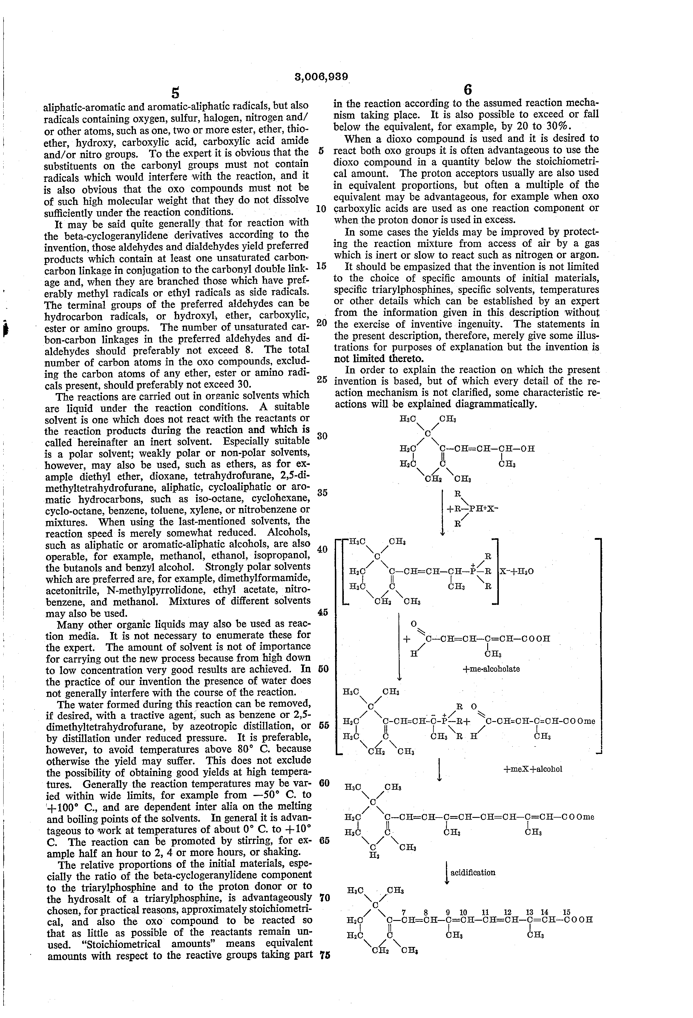 United States Patent 3,006,939 PRODUCTION OF COMPOUNDS OF THE BETA CYCLOGERANYLIDENE SERIES Horst Pommer and Wilhelm Sarnecki, Ludwigshafen (Rhine), Germany, assignors to Badische Anilin- & Soda-Fabrik Aktiengesellschaft, Ludwigshafen (Rhine), Germany No Drawing. Filed Mar. 10, 1959, Ser. No. 798,344 Claims priority, application Germany Jan. 17, 1957 15 Claims. (Cl. 260413) This invention relates to the production of compounds of the beta-cyclogeranylidene series with the aid of phosphines, more particularly to the production of carotenoids or of compounds of the vitamin A series, such as vitamin A acid, its salts and esters.
