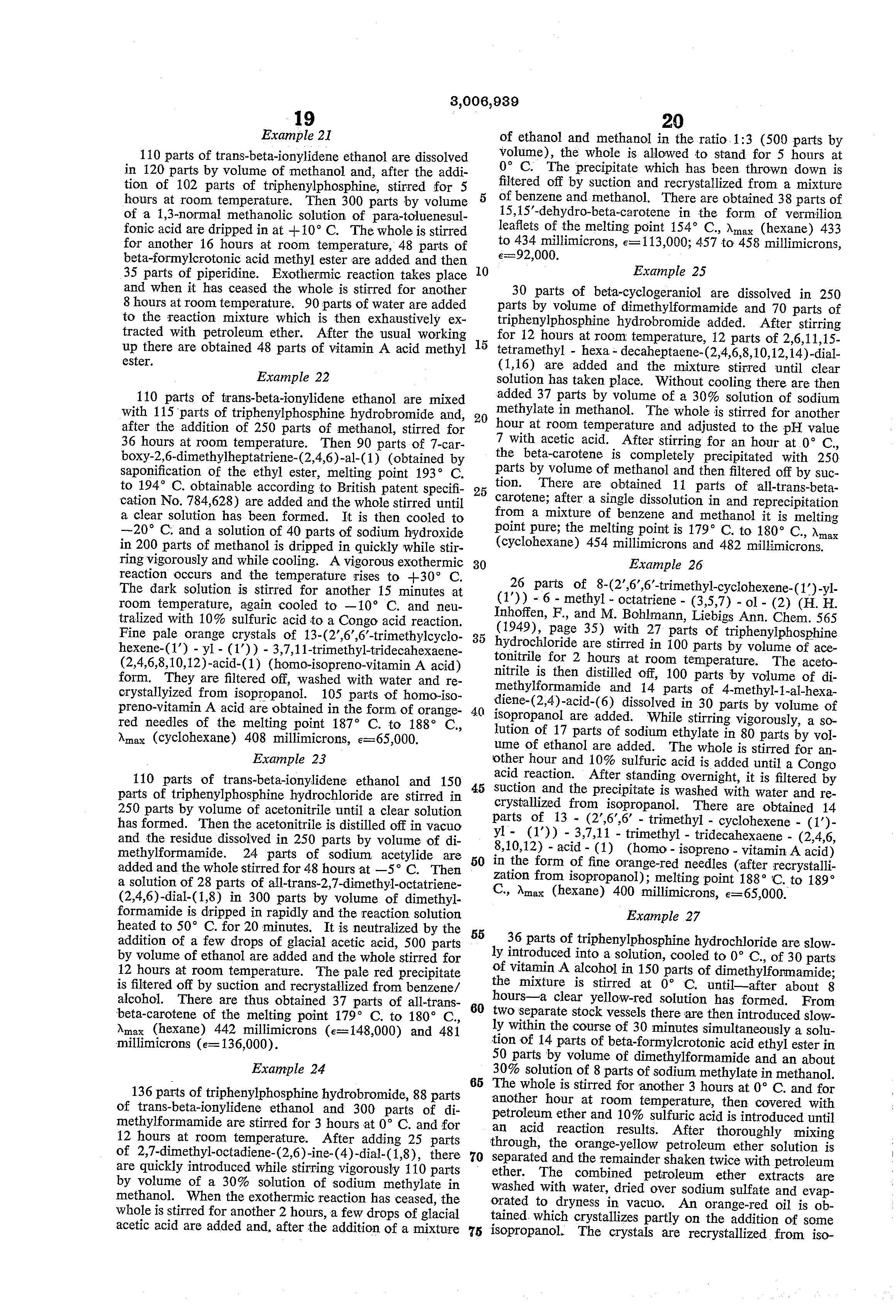 Example 29 75 parts of vitamin A alcohol and 90 parts of triphenylphosphine are stirred with 100 parts by volume of anhydrous ethanol under nitrogen. 70 parts by volume of a S-normal alcoholic hydrochloric acid are then dripped in slowly at room temperature. The whole is stirred for 24 hours and the resulting solution is dripped simultaneously with 90 parts by volume of a 4-norrnal alcoholic caustic potash solution into a solution of 60 parts of vitamin A aldehyde in 60 parts by volume of anhydrous ethanol. The temperature is kept at 0 C, by cooling. After stirring for 2 hours, the deep red precipitate formed is filtered off. The filtrate is extracted with water after the addition of 40 parts by volume of water. The filter residue dissolved in benzene is combined with the deep red extract. For the recovery of the end product, the mixture is washed with water, dried over sodium sulfate and evaporated to dryness. From the crude product, by dissolution in 600 parts by volume of hot benzene and precipitation with 1200 parts by volume of ethanol, all-trans betacarotene crystallizes out; melting point 177 C. to 178 C., A (hexane) 452 millimicrons, e=l47,000) and 481 millimicrons (e=l34,000); yield 97 parts.