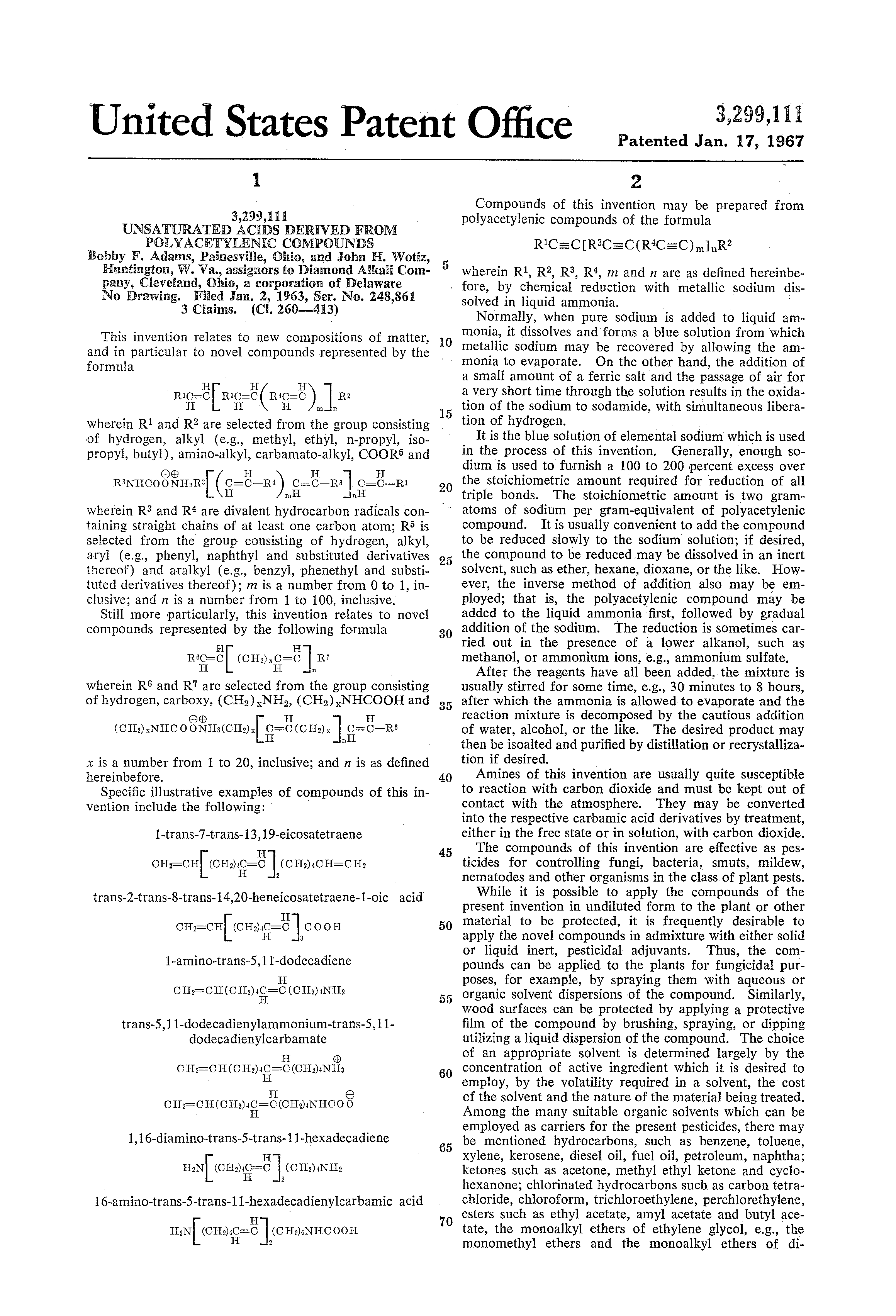 United States Patent 3,299,111 UNSATURATED ACIDS DERIVED FROM POLYACETYLENIQ COMPUUNDS Bobby F. Adams, Painesvilie, Uhio, and John H. Wotiz,
