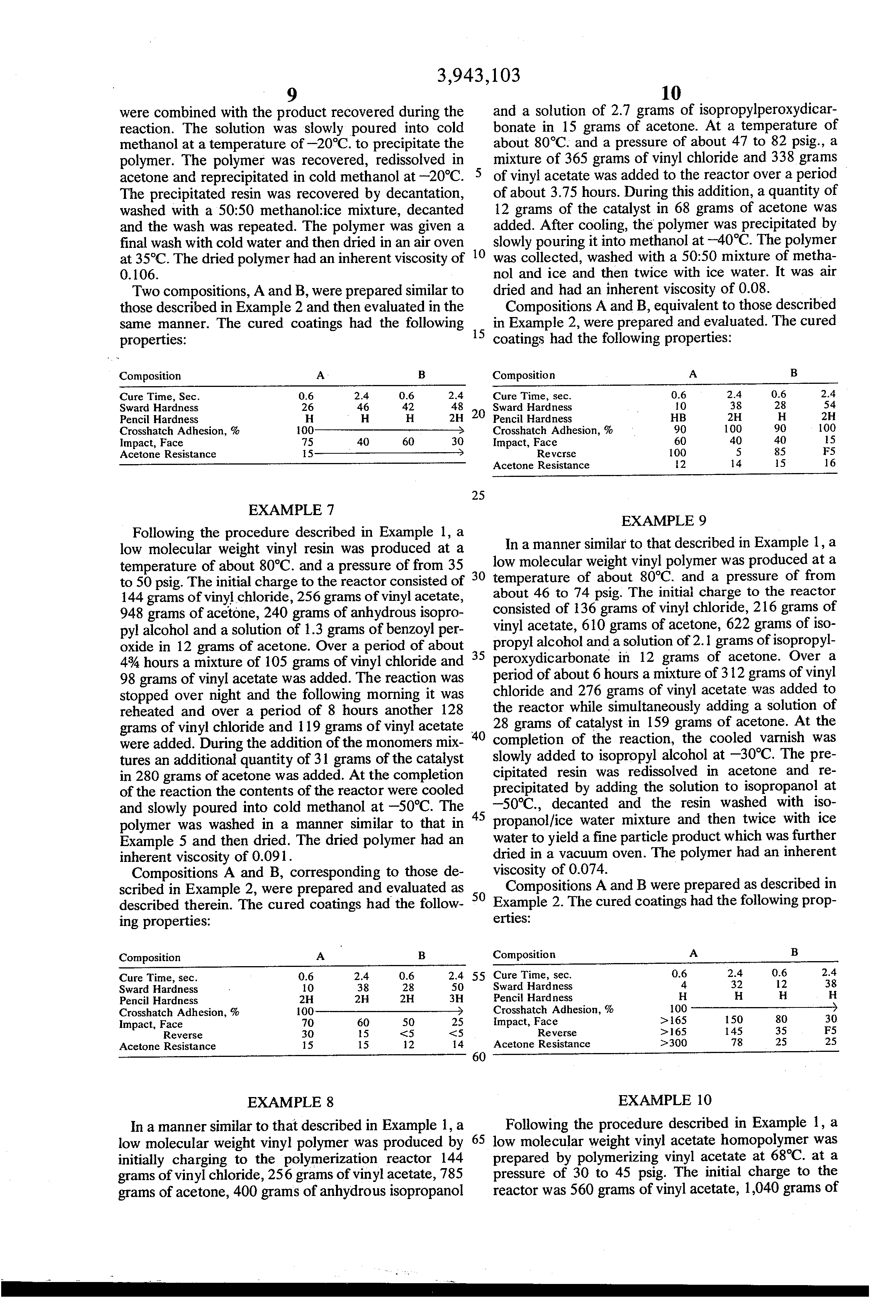 A polymerization reactor was charged with 232 grams of vinyl chloride, 216 grams of vinyl acetate, 32 grams of 2-hydroxypropyl acrylate, 1,108 grams of acetone and a solution of 0.9 gram of isopropylperoxydicarbonate in 12 grams of acetone as the catalyst. The polymerization was carried out over a period of about 25 hours at a temperature of about 73°C. and a pressure of from 41 to 69 psig. During this period there was added, during the first 4 hours, a mixture of 467 grams of vinyl chloride, 170 grams of vinyl acetate and 213 grams of 2-hydroxypropyl acrylate. During the next 21 hours, a mixture of 4,035 grams of vinyl chloride, 2,265 grams of vinyl acetate, 1,345 grams of 2-hydroxypropyl acrylate and 6,500 grams of acetone was added to the polymerization reactor while simultaneously removing reaction mixture at a rate to keep the volume in the reactor substantially constant. Further, an additional quantity of 33 grams of the catalyst in 410 grams of acetone was added during the entire polymerization. At the end of the polymerization reaction the contents of the reactor were combined with the product recovered during the reaction; the total solids in the varnish was 33%. A small portion of the reaction product was precipitated by adding isopropanol and water to the varnish. The terpolymer was filtered, washed and dried. This dried vinyl terpolymer had an inherent viscosity of 0.222.