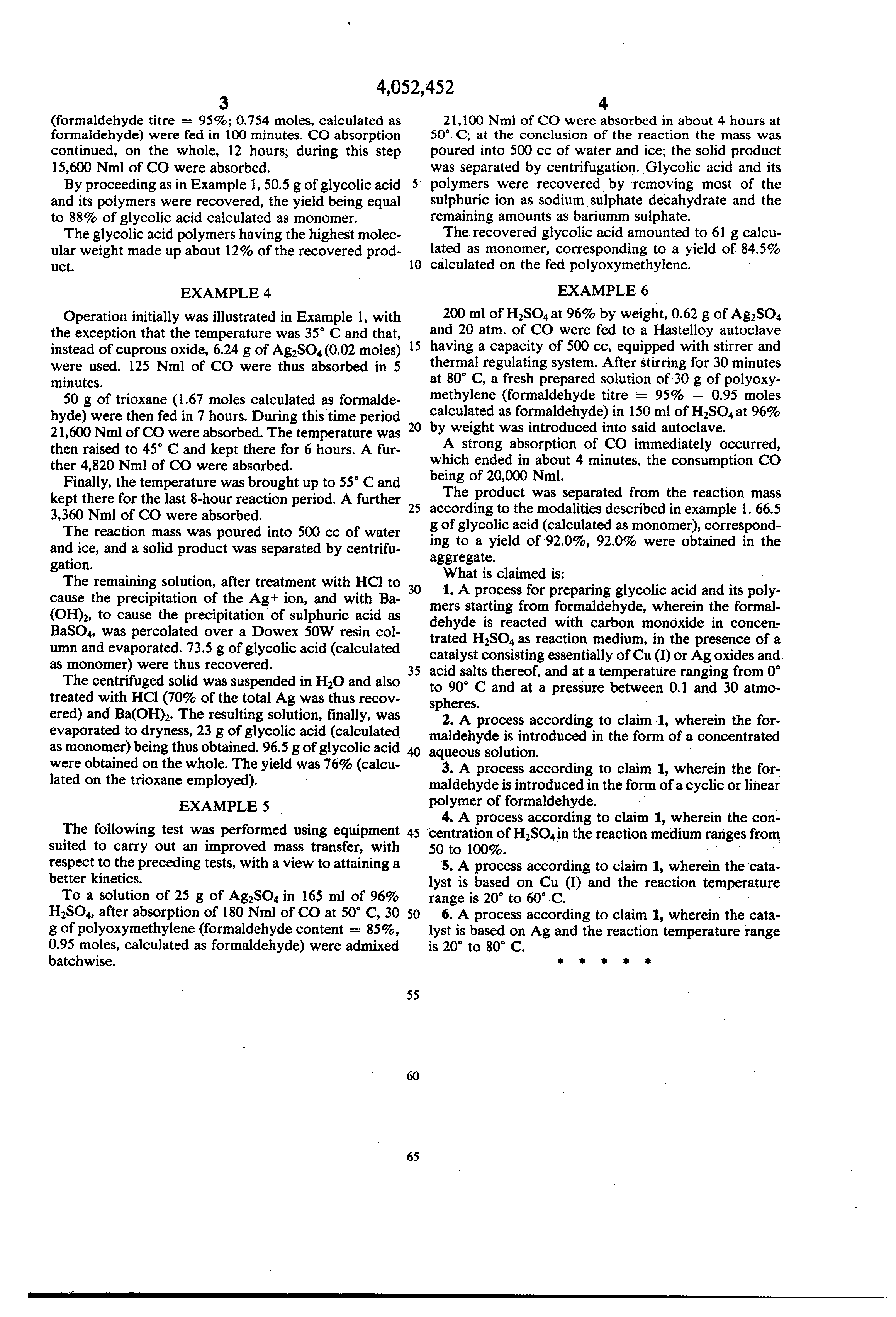 Under intense stirring, CO was gradually fed from the burette, at room pressure, as the absorption went on. 1070 Nml of CO were absorbed in 35 minutes. 40 ml of a formaldehyde aqueous solution at 38% (weight/vol.) were fed at a flow rate of 12ml/hr. At the conclusion of the formaldehyde feeding, CO absorption was allowed to continue; it stopped after about 13 hours (10,850 Nml were absorbed). The reaction mass was then poured into 500 cc of water and ice, and the insoluble part (consisting of polymers higher than glycolic acid) was filtered.