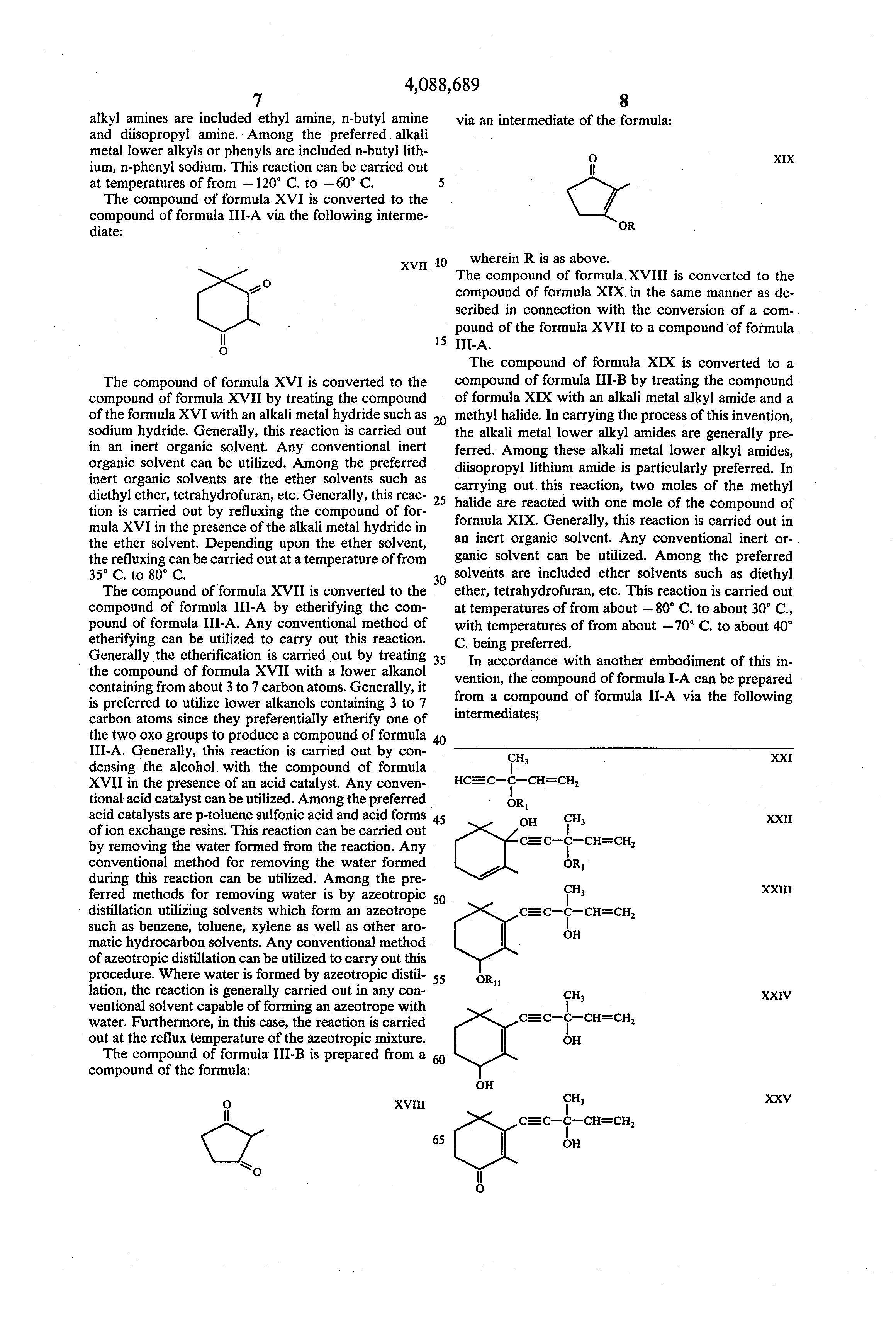The compound of formula XVII is converted to the compound of formula III-A by etherifying the compound of formula III-A. Any conventional method of etherifying can be utilized to carry out this reaction. Generally the etherification is carried out by treating the compound of formula XVII with a lower alkanol containing from about 3 to 7 carbon atoms. Generally, it is preferred to utilize lower alkanols containing 3 to 7 carbon atoms since they preferentially etherify one of the two oxo groups to produce a compound of formula III-A. Generally, this reaction is carried out by condensing the alcohol with the compound of formula XVII in the presence of an acid catalyst. Any conventional acid catalyst can be utilized. Among the preferred acid catalysts are p-toluene sulfonic acid and acid forms of ion exchange resins. This reaction can be carried out by removing the water formed from the reaction. Any conventional method for removing the water formed during this reaction can be utilized. Among the preferred methods for removing water is by azeotropic distillation utilizing solvents which form an azeotrope such as benzene, toluene, xylene as well as other aromatic hydrocarbon solvents. Any conventional method of azeotropic distillation can be utilized to carry out this procedure. Where water is formed by azeotropic distillation, the reaction is generally carried out in any conventional solvent capable of forming an azeotrope with water. Furthermore, in this case, the reaction is carried out at the reflux temperature of the azeotropic mixture.