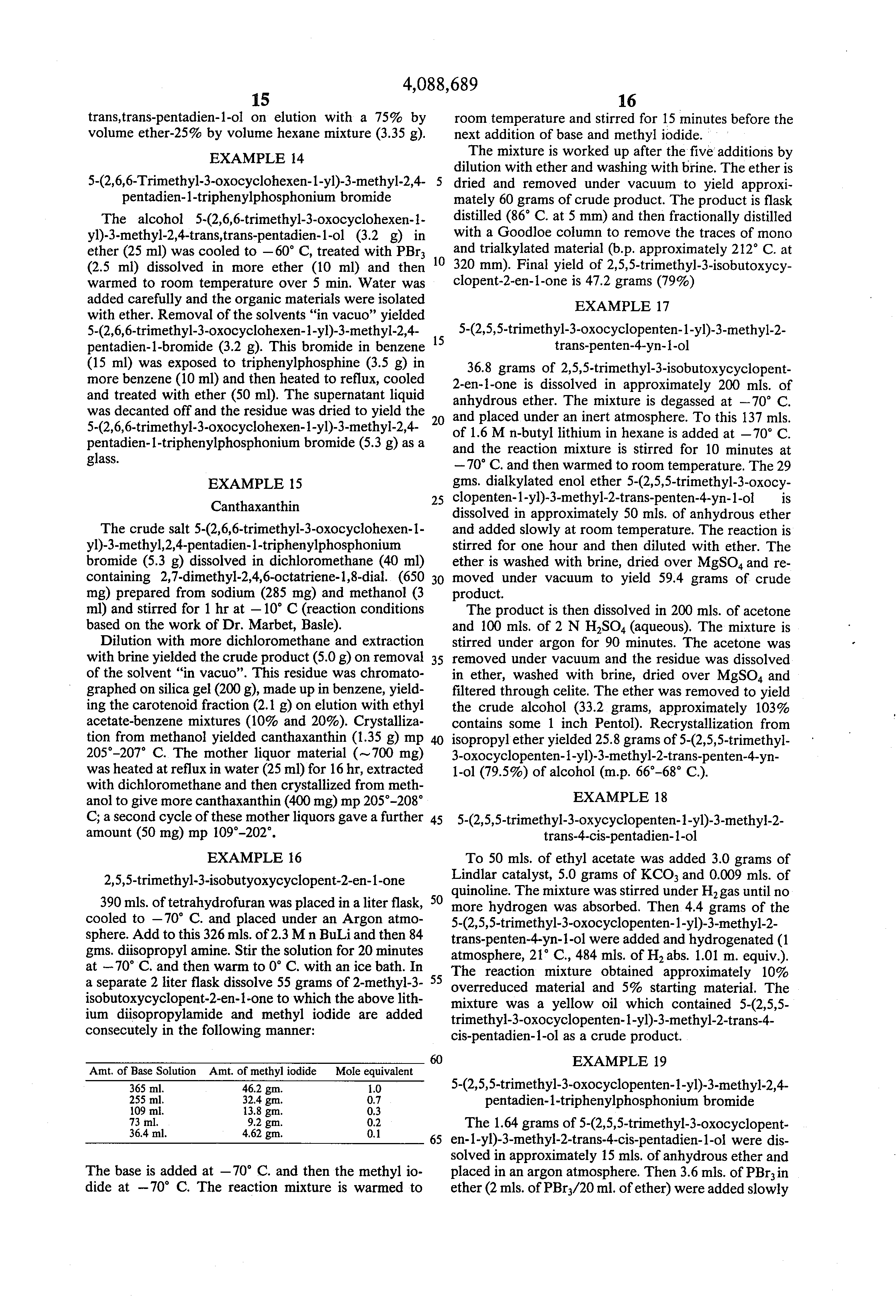 To this bromide solution was added 1.95 grams of triphenyl phosphine dissolved in approximately 20 mls. of benzene. The solution was refluxed with 11/2 hours. The solution was cooled and anhydrous ether was added precipitating out 5-(2,5,5-trimethyl-3-oxocyclopenten-1-yl)-3-methyl-2,4-pentadien-1-triphenylphosphonium bromide.