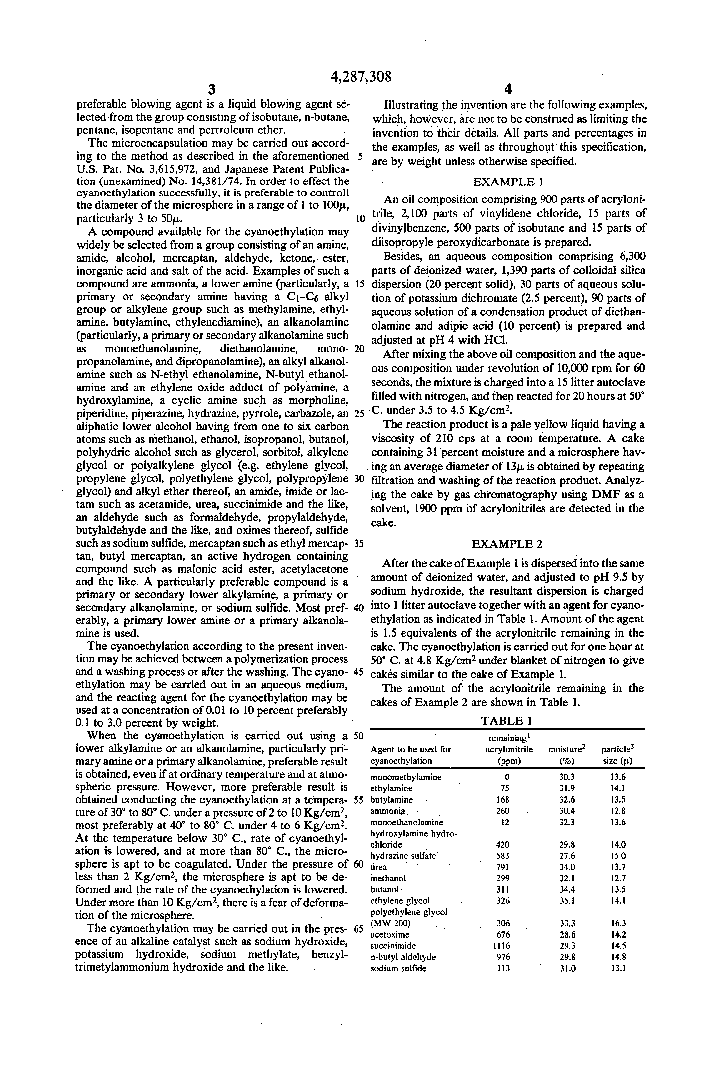 TABLE 1______________________________________ remaining1Agent to be used for acrylonitrile moisture2 particle3cyanoethylation (ppm) (%) size (μ)______________________________________monomethylamine 0 30.3 13.6ethylamine 75 31.9 14.1butylamine 168 32.6 13.5ammonia 260 30.4 12.8monoethanolamine 12 32.3 13.6hydroxylamine hydro-chloride 420 29.8 14.0hydrazine sulfate 583 27.6 15.0urea 791 34.0 13.7methanol 299 32.1 12.7butanol 311 34.4 13.5ethylene glycol 326 35.1 14.1polyethylene glycol(MW 200) 306 33.3 16.3acetoxime 676 28.6 14.2succinimide 1116 29.3 14.5n-butyl aldehyde 976 29.8 14.8sodium sulfide 113 31.0 13.1Blank 1900 31.0 13.0______________________________________ 1 remaining acrylonitrile: detected by the same process in Example 1 2 moisture: determined by Karl Fischer method 3 particle size: referred to the particle size of greatest frequency profiling the distribution curves of 0.1 percent aqueous dispersion of th microsphere by a Coulter Counter