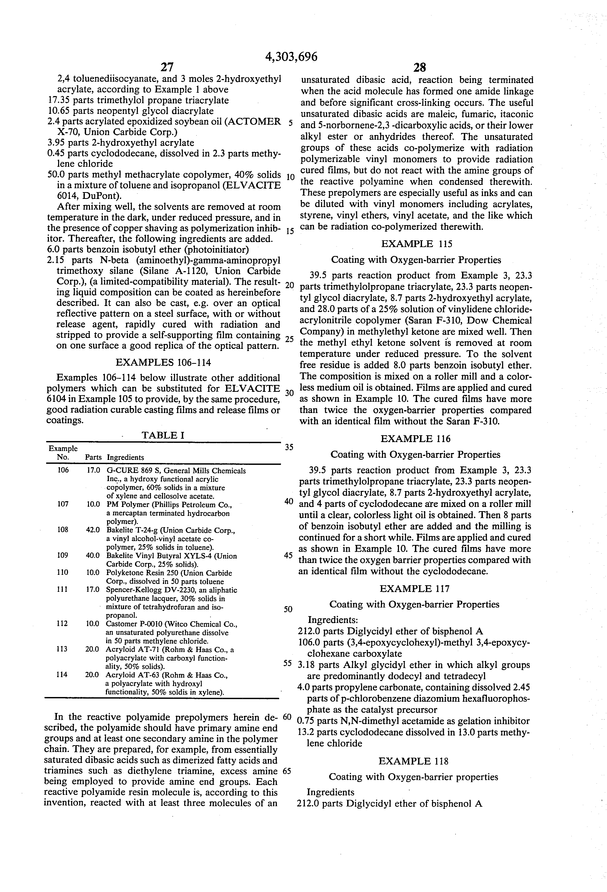 Films of 0.4 mil thickness are applied with a wire wound coating rod onto paper, aluminum foil, vinyl coated aluminum foil, polyester coated mylar, and steel. The coated substrates are exposed for 1/10 second to the UV radiation given off by a medium pressure mercury vapor lamp (Hanovia, 200 W/inch) at a distance of 5" from the lamp. This distance coincides with the second focal point created by the elliptical reflector.