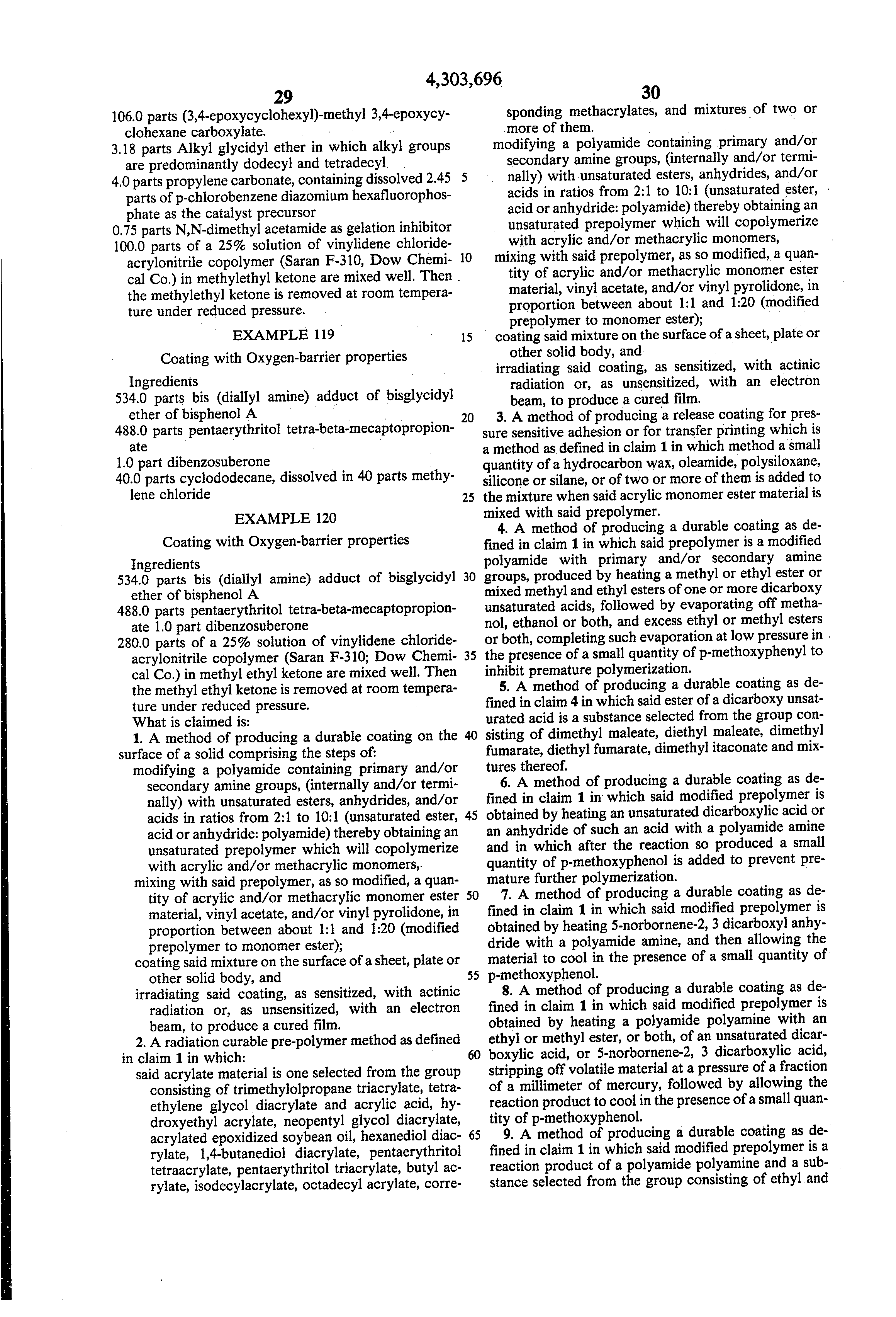 The foregoing aspects of the invention are illustrated in detail in the following examples wherein all parts are by weight. Examples 1-9 and 15-22 illustrate the preparation of prepolymers used in the formulations described in Examples 10-14 and 23-26. Examples 27-104 refer particularly to release type coatings. Examples 104-114 illustrate the advantageous inclusion of linear polymers in the radiation curable coatings. Examples 115 and 116 demonstrate the preparation of coatings with excellent oxygen barrier properties based on a radiation curable acrylic system; Examples 117 and 118 are oxygen barrier coatings based on a radiation curable epoxide system, while Examples 119 and 120 are oxygen barrier coatings based on a polyene-polythiol system.