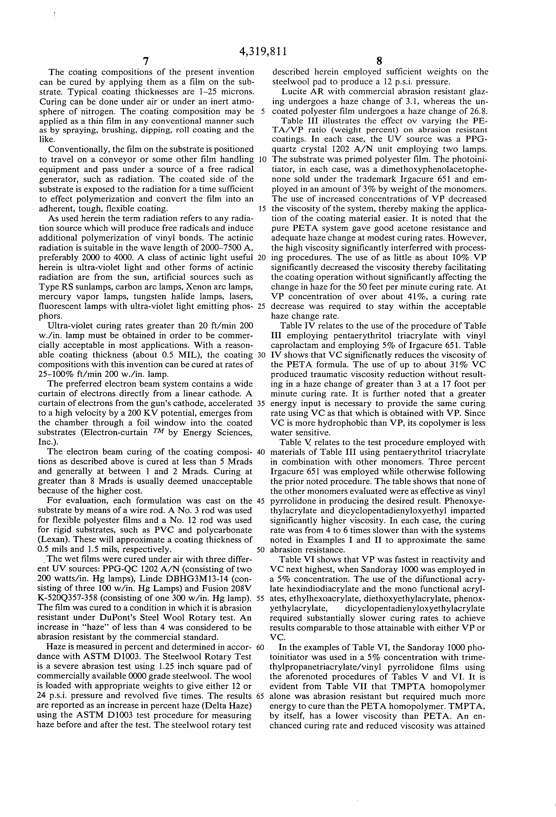Table III illustrates the effect ov varying the PETA/VP ratio (weight percent) on abrasion resistant coatings. In each case, the UV source was a PPG-quartz crystal 1202 A/N unit employing two lamps. The substrate was primed polyester film. The photoinitiator, in each case, was a dimethoxyphenolacetophenone sold under the trademark Irgacure 651 and employed in an amount of 3% by weight of the monomers. The use of increased concentrations of VP decreased the viscosity of the system, thereby making the application of the coating material easier. It is noted that the pure PETA system gave good acetone resistance and adequate haze change at modest curing rates. However, the high viscosity significantly interferred with processing procedures. The use of as little as about 10% VP significantly decreased the viscosity thereby facilitating the coating operation without significantly affecting the change in haze for the 50 feet per minute curing rate. At VP concentration of over about 41%, a curing rate decrease was required to stay within the acceptable haze change rate.