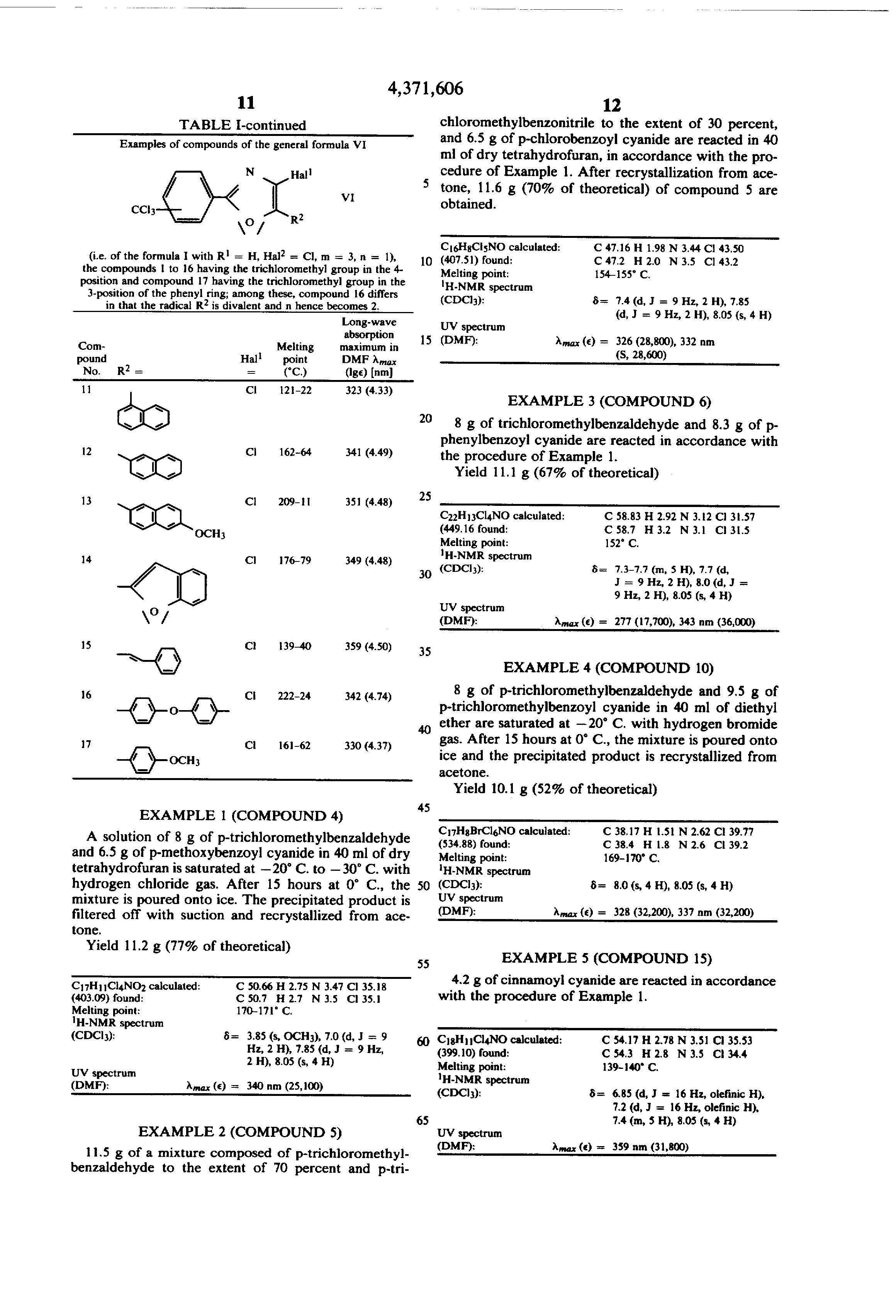 TABLE I______________________________________Examples of compounds of the general formula VI ##STR12##(i.e. of the formula I with R1 = H, Hal2 = Cl, m = 3, n = 1),the compounds 1 to 16 having the trichloromethyl group in the 4-position and compound 17 having the trichloromethyl group in the3-position of the phenyl ring; among these, compound 16 differsin that the radical R2 is divalent and n hence becomes 2. Long-wave absorptionCom- Melting maximum inpound Hal1 point DMF λmaxNo. R2 = = (°C.) (lgε) [nm]______________________________________ ##STR13## Cl 129-30 326 (4.40)2 ##STR14## Br 123-25 325 (4.40)3 ##STR15## Cl 150-51 332 (4.41)4 ##STR16## Cl 170-71 340 (4.40)5 ##STR17## Cl 154-55 326 (4.46)6 ##STR18## Cl 152 343 (4.56)7 ##STR19## Cl 259-60 359 (4.71)8 ##STR20## Cl 160-62 366 (4.71)9 ##STR21## Cl 176-77 337 (4.52)10 ##STR22## Br 169-70 337 (4.51)11 ##STR23## Cl 121-22 323 (4.33)12 ##STR24## Cl 162-64 341 (4.49)13 ##STR25## Cl 209-11 351 (4.48)14 ##STR26## Cl 176-79 349 (4.48)15 ##STR27## Cl 139-40 359 (4.50)16 ##STR28## Cl 222-24 342 (4.74)17 ##STR29## Cl 161-62 330 (4.37)______________________________________