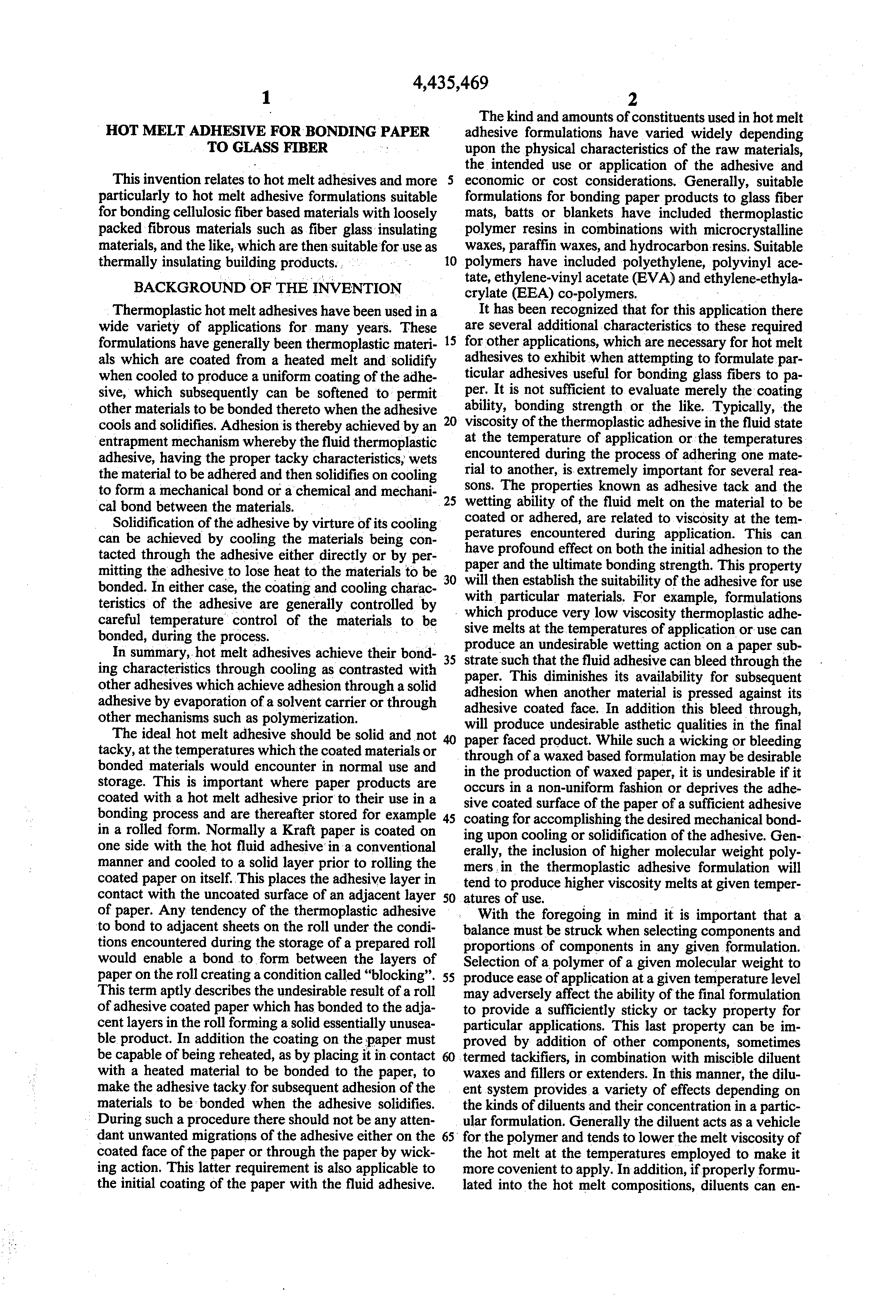 It has been recognized that for this application there are several additional characteristics to these required for other applications, which are necessary for hot melt adhesives to exhibit when attempting to formulate particular adhesives useful for bonding glass fibers to paper. It is not sufficient to evaluate merely the coating ability, bonding strength or the like. Typically, the viscosity of the thermoplastic adhesive in the fluid state at the temperature of application or the temperatures encountered during the process of adhering one material to another, is extremely important for several reasons. The properties known as adhesive tack and the wetting ability of the fluid melt on the material to be coated or adhered, are related to viscosity at the temperatures encountered during application. This can have profound effect on both the initial adhesion to the paper and the ultimate bonding strength. This property will then establish the suitability of the adhesive for use with particular materials. For example, formulations which produce very low viscosity thermoplastic adhesive melts at the temperatures of application or use can produce an undesirable wetting action on a paper substrate such that the fluid adhesive can bleed through the paper. This diminishes its availability for subsequent adhesion when another material is pressed against its adhesive coated face. In addition this bleed through, will produce undesirable asthetic qualities in the final paper faced product. While such a wicking or bleeding through of a waxed based formulation may be desirable in the production of waxed paper, it is undesirable if it occurs in a non-uniform fashion or deprives the adhesive coated surface of the paper of a sufficient adhesive coating for accomplishing the desired mechanical bonding upon cooling or solidification of the adhesive. Generally, the inclusion of higher molecular weight polymers in the thermoplastic adhesive formulation will tend to produce higher viscosity melts at given temperatures of use.