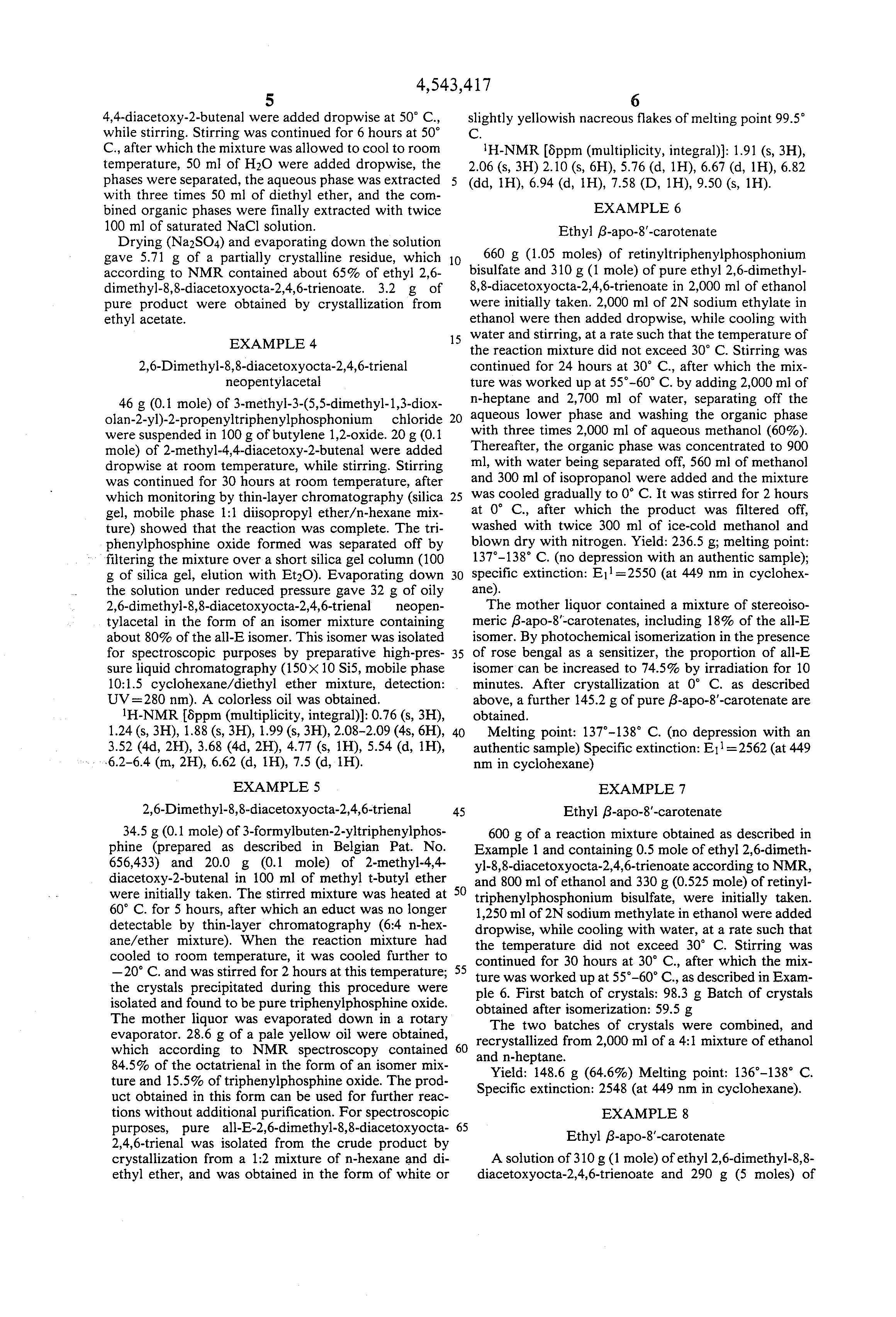 To work up the mixture, 100 ml of hexane and 100 ml of a 6:4 mixture of methanol with H2 O were added, while cooling with ice. The phases were separated, and the hexane phase was washed with twice 100 ml of aqueous methanol (60%), dried with Na2 SO4 and evaporated down in a rotary evaporator at 40° C. and under reduced pressure from a waterpump. The residue which remained consisted of 40.9 g of crystals, which according to NMR comprised 65% of ethyl 2,6-dimethyl-8,8-diacetoxyocta-2,4,6-trienoate and 35% of triphenylphosphine oxide. These crystals were stirred up in 50 ml of methanol at 0° C., the mixture was filtered and the filtrate was dried over Na2 SO4 ; 20.5 g of the product were obtained in a purity of above 90%.