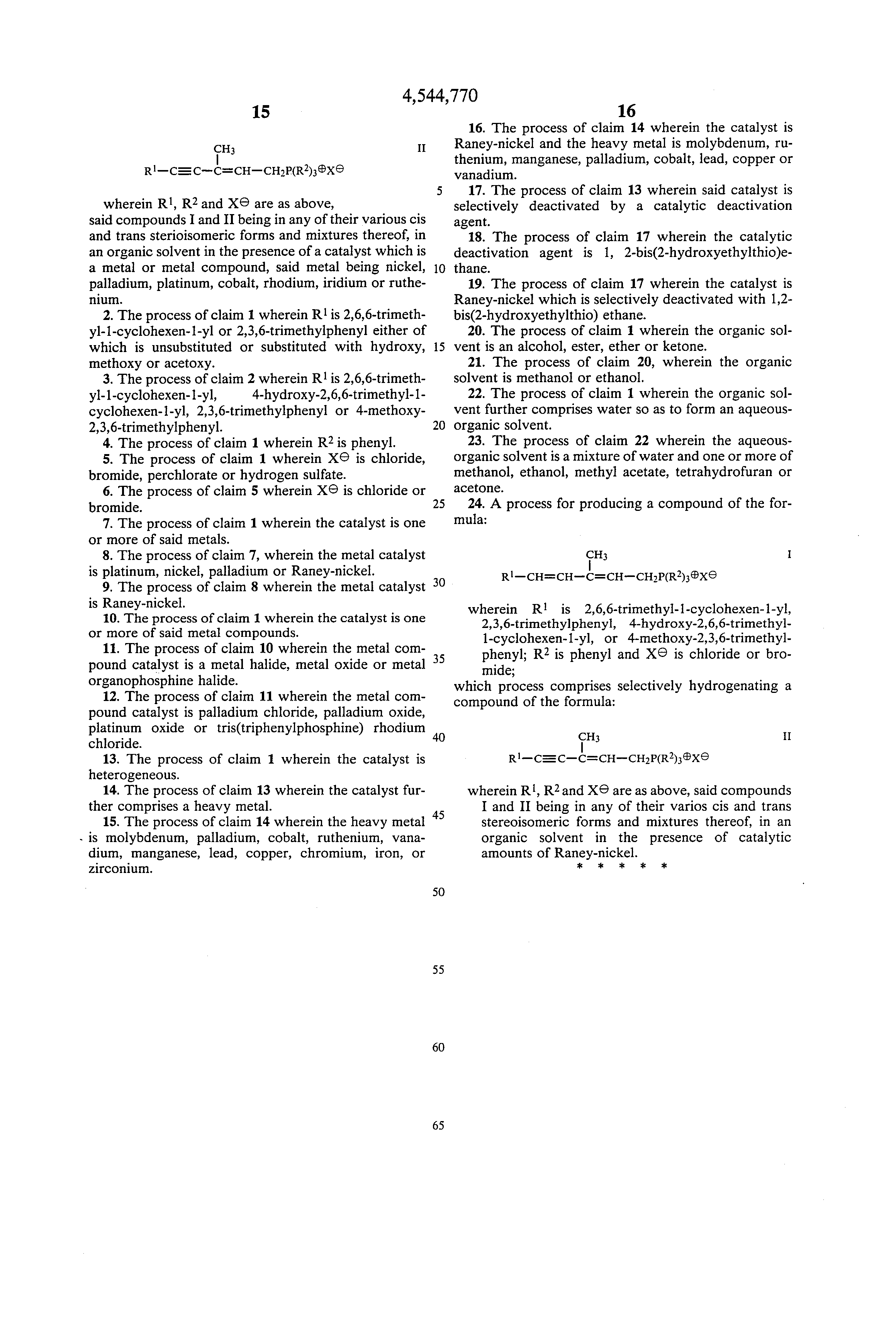 In a manner analogous to that described in Example 19, 200 g of (4R,2E)-[5-(4-hydroxy-2,6,6-trimethyl-1-cyclohexen-1-yl)-3-methyl-2-penten-4-ynyl]triphenylphosphonium chloride were hydrogenated at 40° C. and 1.1 bar of hydrogen in the presence of 58 g of Raney-nickel which was water-moist and pre-treated with 650 mg of 1,2-bis(2-hydroxyethylthio)ethane. After cooling, the solution which was above the catalyst was sucked off, filtered and worked-up as described in Example 19. This procedure was repeated twice more, there being used each time the catalyst residue of the preceding cycle, 2 l of methanol, 11 g of fresh Raney-nickel and 200 g of educt and the hydrogenation being carried out at 40° C. and 1.1 bar of hydrogen. The respective hydrogenation time t and the yield of crystalline [5-(4-hydroxy-2,6,6-trimethyl-1-cyclohexen-1-yl)-3-methyl-2,4-pentadienyl]triphenylphosphonium chloride as well as its content of the (4R,2E,4Z)-isomer in accordance with HPLC and the [α]D 20 values (c=1, chloroform) are given in Table 4.