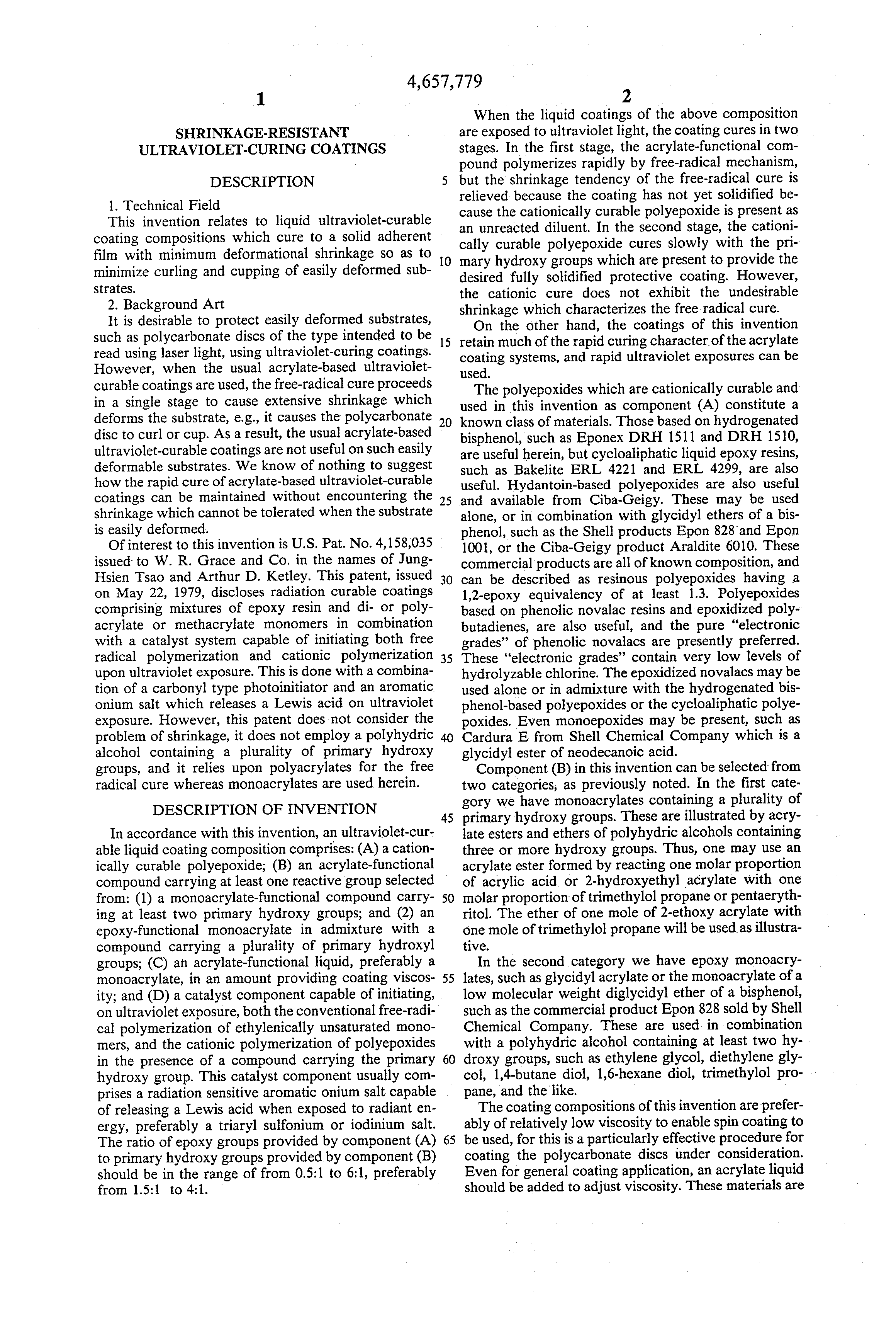 Of interest to this invention is U.S. Pat. No. 4,158,035 issued to W. R. Grace and Co. in the names of Jung-Hsien Tsao and Arthur D. Ketley. This patent, issued on May 22, 1979, discloses radiation curable coatings comprising mixtures of epoxy resin and di- or poly-acrylate or methacrylate monomers in combination with a catalyst system capable of initiating both free radical polymerization and cationic polymerization upon ultraviolet exposure. This is done with a combination of a carbonyl type photoinitiator and an aromatic onium salt which releases a Lewis acid on ultraviolet exposure. However, this patent does not consider the problem of shrinkage, it does not employ a polyhydric alcohol containing a plurality of primary hydroxy groups, and it relies upon polyacrylates for the free radical cure whereas monoacrylates are used herein.