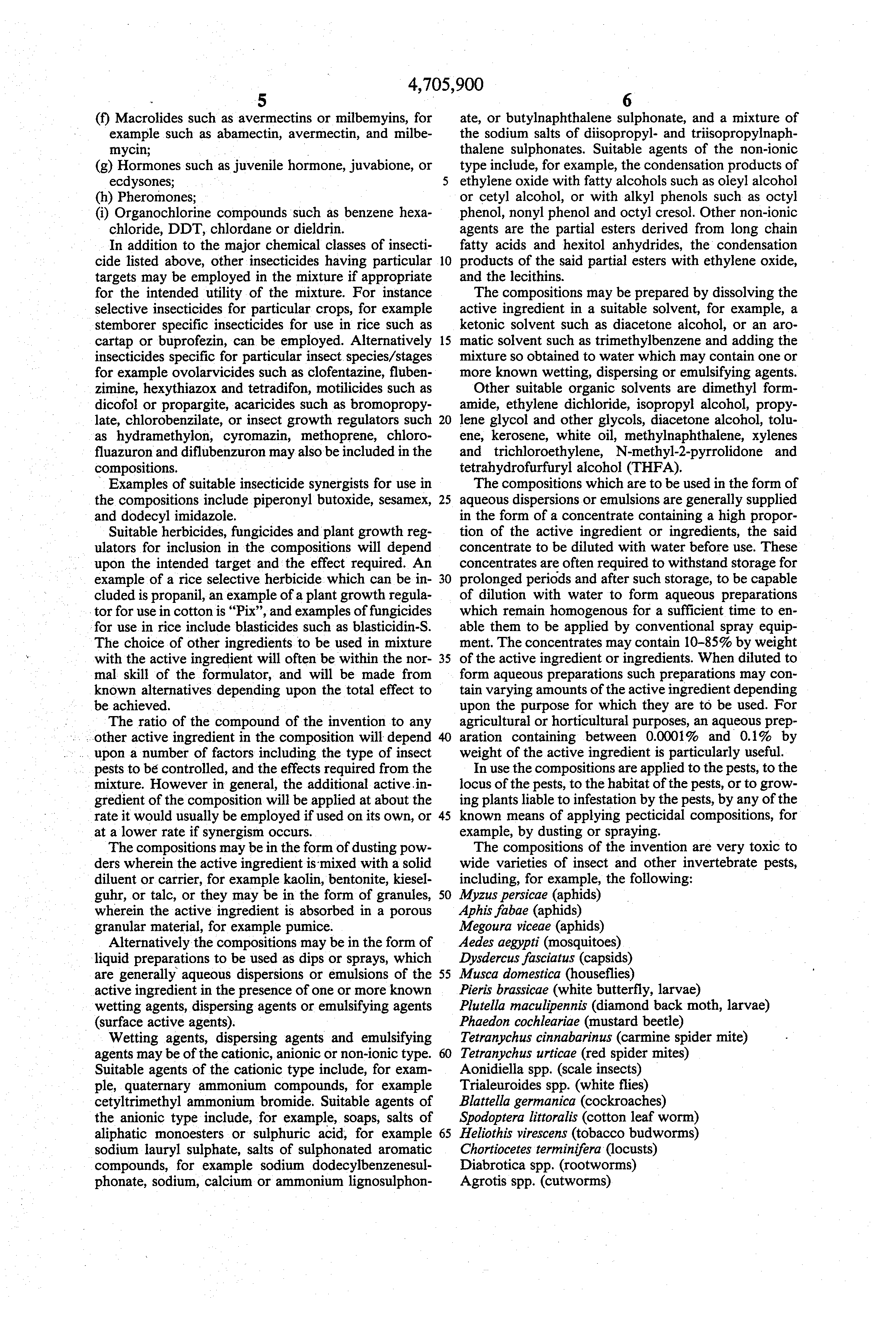 In use the compositions are applied to the pests, to the locus of the pests, to the habitat of the pests, or to growing plants liable to infestation by the pests, by any of the known means of applying pecticidal compositions, for example, by dusting or spraying.