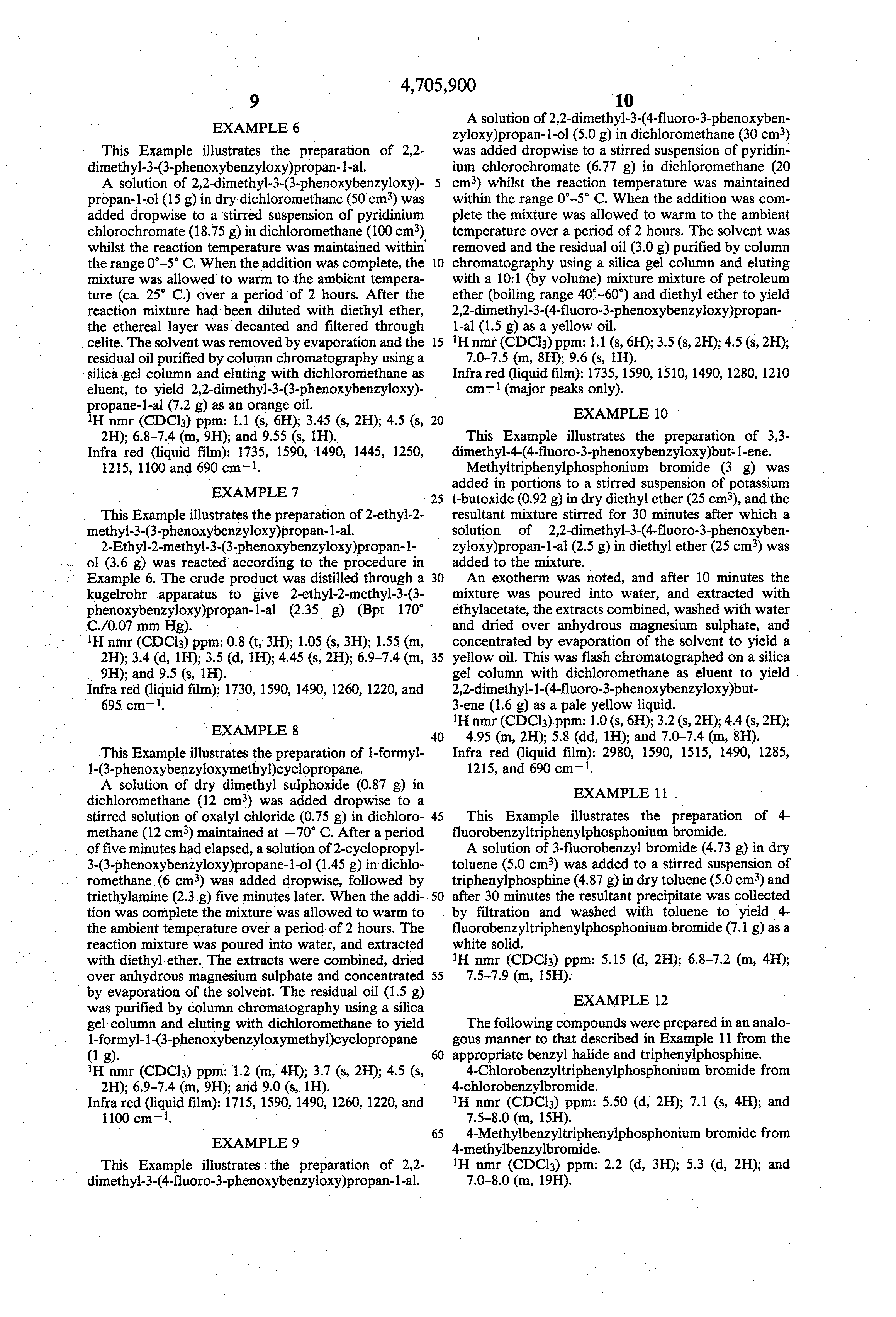A suspension of sodium hydride (0.1 g) in dry dimethylsulphoxide (15 cm3) was heated to 65° C. for a period of 11/2 hours. After cooling to the ambient temperature (ca. 25° C.) 4-trifluoromethylphenyltriphenylphosphonium bromide (1.75 g) was added in portions, and the mixture was stirred for a further hour. A solution of 2,2-dimethyl-3-(3-phenoxybenzyloxy)propan-1-al in dimethylsulphoxide (15 cm3) was then added, and after stirring for 2 hours, the reaction mixture was poured into water and extracted into ethylacetate. The extracts were combined, washed with water and dried over anhydrous magnesium sulphate, and concentrated by evaporation of the solvent to yield an orange oil. This was flash chromatographed on a silica gel column with dichloromethane as eluent to yield 3,3-dimethyl-1-(4-trifluoromethylphenyl)-4-(3-phenoxybenzyloxy)but-1-ene (0.7 g) as a colourless oil, identified by nmr spectroscopy as an impure mixture of the Z and E isomers (ratio 3:1).