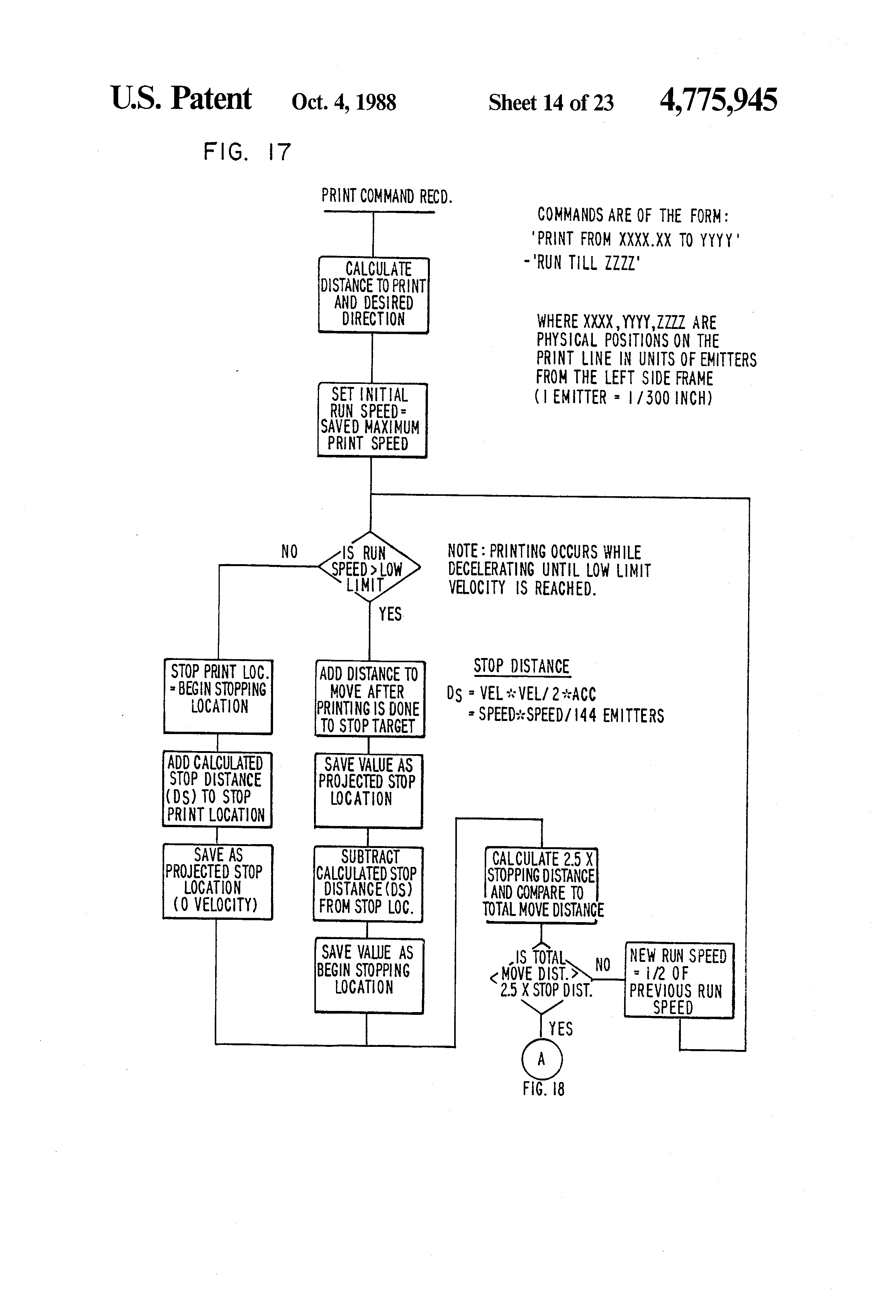 FIG. 17 is a flow chart of the motion speed selection process for a print command utilized in the present invention;