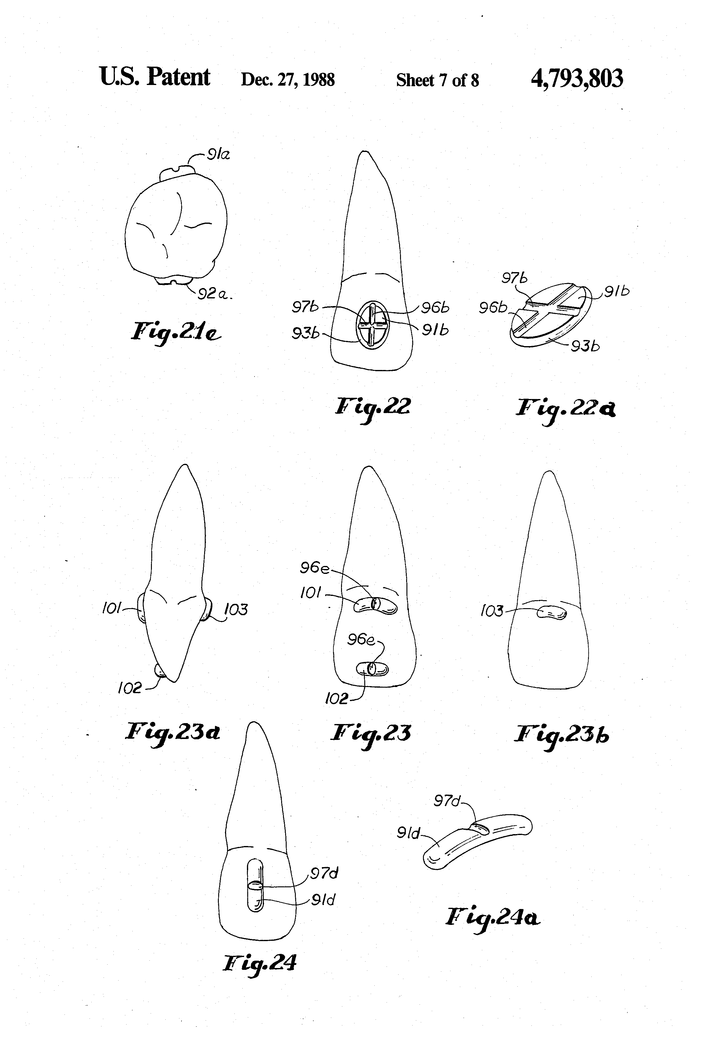 Turning now to FIGS. 23, 23A and 23B on the facial side of the incisor there is shown upper and lower buttons 101 and 102, and on the lingual side at least an upper button 103 (the lower button being optional). Each of the buttons is oval with its longest axis horizontal. Preferably at least on the facial side, buttons 101 and 102 are formed with vertical grooves 96c. No groove is shown in FIG. 23B, but such a groove is optional.