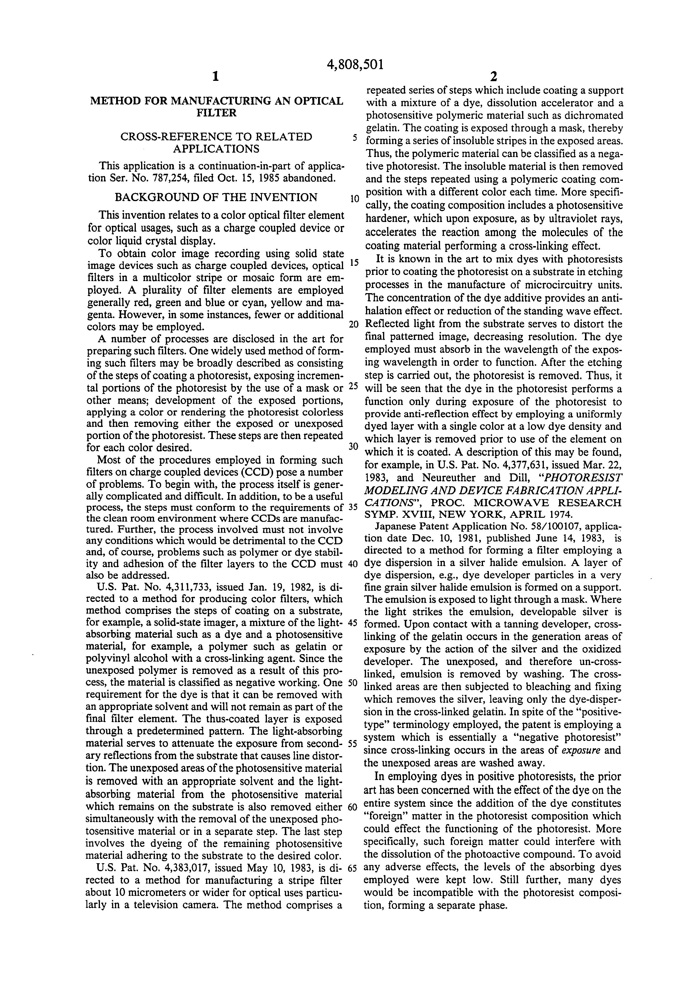 Most of the procedures employed in forming such filters on charge coupled devices (CCD) pose a number of problems. To begin with, the process itself is generally complicated and difficult. In addition, to be a useful process, the steps must conform to the requirements of the clean room environment where CCDs are manufactured. Further, the process involved must not involve any conditions which would be detrimental to the CCD and, of course, problems such as polymer or dye stability and adhesion of the filter layers to the CCD must also be addressed.