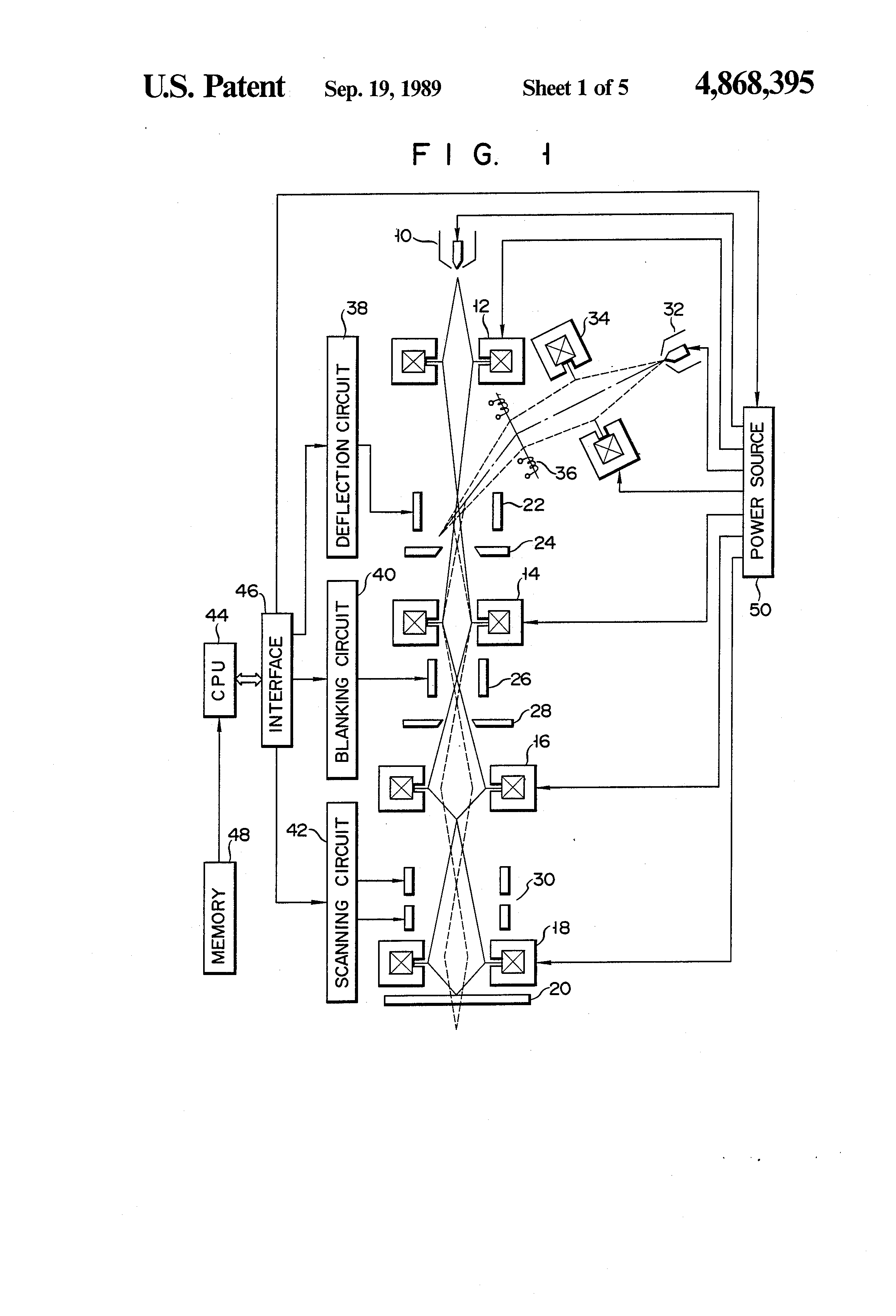 FIG. 1 is a schematic view of a lithography system using electron beams according to a first embodiment of the present invention. Below a first electron gun 10 for emitting a first electron beam, there are arranged first, second and third condenser lenses 12, 14 and 16, an objective lens 18, and a substrate (or target) 20 on which a pattern is delineated by electron beams. A deflector 22 is disposed between the first and second condenser lenses 12 and 14 and in the vicinity of an electron beam path along which a crossover image of electron beam is formed. The deflector 22 serves to deflect electron beams, thereby selecting an electron beam to be incident on the substrate 20. Disposed between the deflector 22 and the second condenser lens 14 is a plate 24 on which a nonselected electron beam is to impinge. A blanking electrode 26 for deflecting the electron beams is provided between the second and third condenser lenses 14 and 16. Disposed between the blanking electrode 26 and the third condenser lens 16 is a blanking plate 28 on which the deflected electron beams are to impinge. Arranged between the third condenser lens 16 and the objective lens 18 is scanning deflector 30 for deflecting the electron beams in an X-direction (horizontal direction of FIG. 1) and in a Y-direction (perpendicular to the drawing plane of FIG. 1) above the surface of the substrate 20.