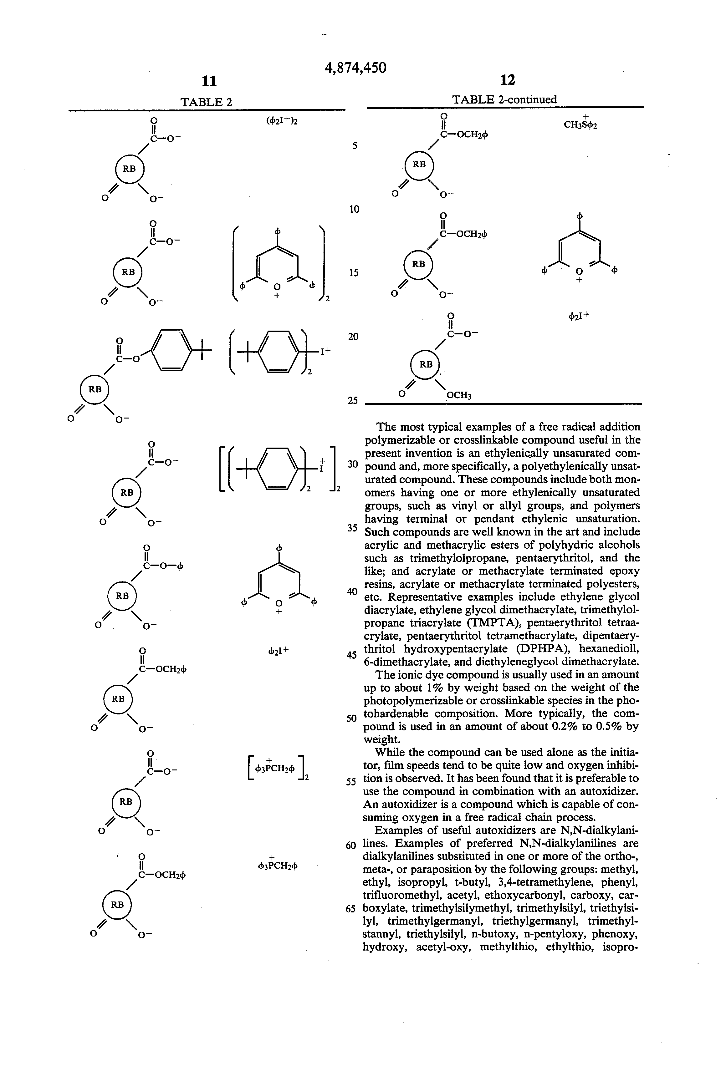 where ΔG is the change in the Gibbs free energy, Eox is the oxidation potential of the borate anion BR- 4, Ered is the reduction potential of the cation: dye, and En the energy of light used to excite the dye. Useful compounds will have a negative free energy change. Similarly, the difference between the reduction potential of the dye and the oxidation potential of the borate must be negative for the compounds to be dark stable, i.e., Eox - Ered>0.