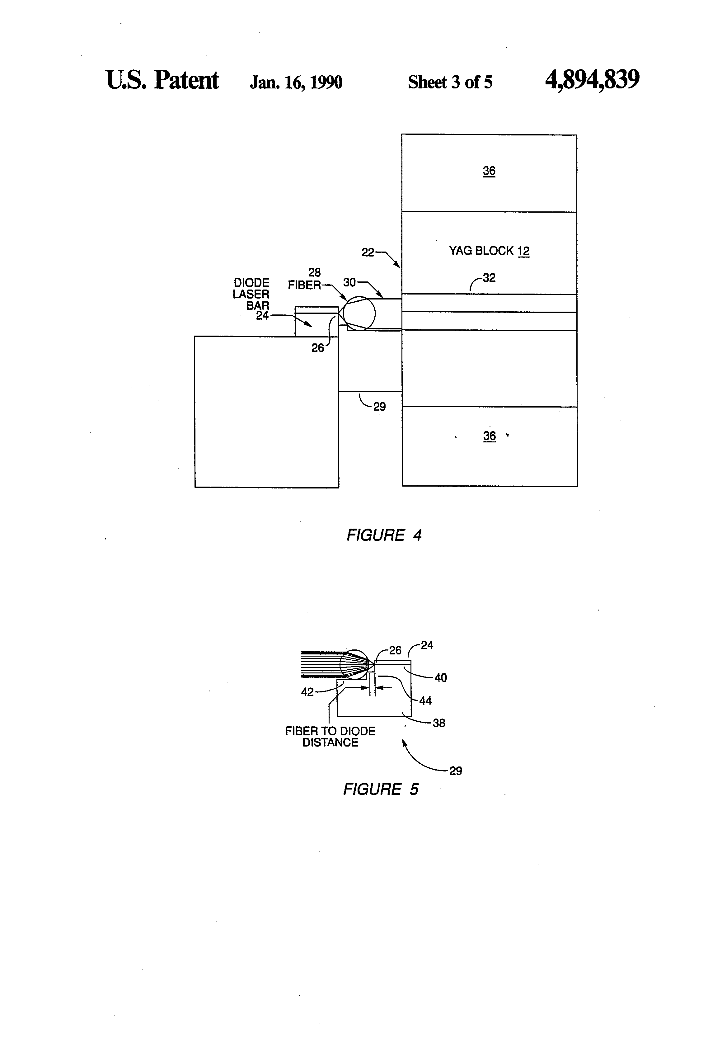 The surfaces of sides 20, 22 are coated with a suitable anti-reflection (AR) coating; further coating layers which form a high reflectively (HR) coating are placed on the portions of sides 20, 22 where the laser beam is to be reflected back into block 12. As shown, the region of side 20 between the two entrance/exit points of the laser beam has an HR coating, while all of side 22 could have an HR coating. The coatings are further described herein. Diode bar 24, placed along side 22, forms the pumping source. Diode bar 24 contains a plurality of separate laser diode arrays 26 spaced along its length. The emissions from laser diode arrays 26 on bar 24 are matched to the mode volume of laser 10 by means of a fiber lens collimator 28 and by selecting the fold angle of the zig-zag portion 18 of the resonator to match the divergence of diode arrays 26, as will be further explained below. An optional intra-cavity element 34 may also be included, as described herein. In some cases, collimator 28 may be unnecessary; diode arrays 26 could be butted against block 12.
