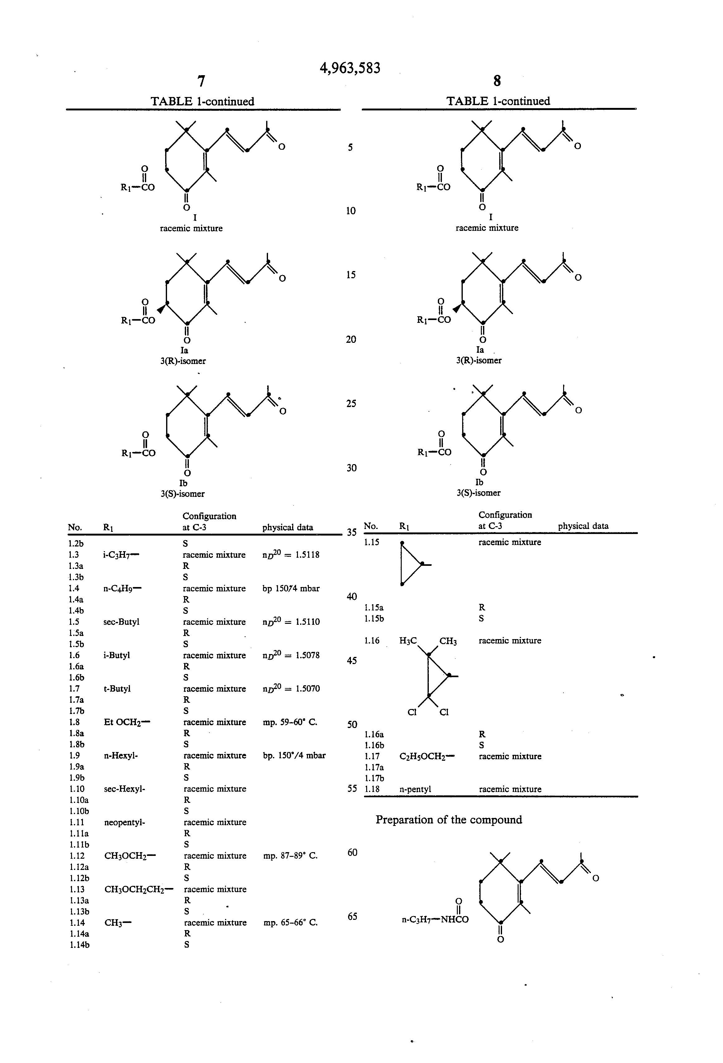 TABLE 1______________________________________ ##STR13## ##STR14## ##STR15## ConfigurationNo. R1 at C-3 physical data______________________________________1.1 C2 H5 racemic mixture1.1a R1.1b S1.2 n-C3 H7 racemic mixture nD 20 = 1.51521.2a R1.2b S1.3 i-C3 H7 racemic mixture nD 20 = 1.51181.3a R1.3b S1.4 n-C4 H9 racemic mixture bp 150/4 mbar1.4a R1.4b S1.5 sec-Butyl racemic mixture nD 20 = 1.51101.5a R1.5b S1.6 i-Butyl racemic mixture nD 20 = 1.50781.6a R1.6b S1.7 t-Butyl racemic mixture nD 20 = 1.50701.7a R1.7b S1.8 Et OCH2 racemic mixture mp. 59-60° C.1.8a R1.8b S1.9 n-Hexyl- racemic mixture bp. 150°/4 mbar1.9a R1.9b S1.10 sec-Hexyl- racemic mixture1.10a R1.10b S1.11 neopentyl- racemic mixture1.11a R1.11b S1.12 CH3 OCH2 racemic mixture mp. 87-89° C.1.12a R1.12b S1.13 CH3 OCH2 CH2 racemic mixture1.13a R1.13b S1.14 CH3 racemic mixture mp. 65- 66° C.1.14a R1.14b S1.15 ##STR16## racemic mixture1.15a R1.15b S1.16 ##STR17## racemic mixture1.16a R1.16b S1.17 C2 H5 OCH2 racemic mixture1.17a1.17b1.18 n-pentyl racemic mixture______________________________________