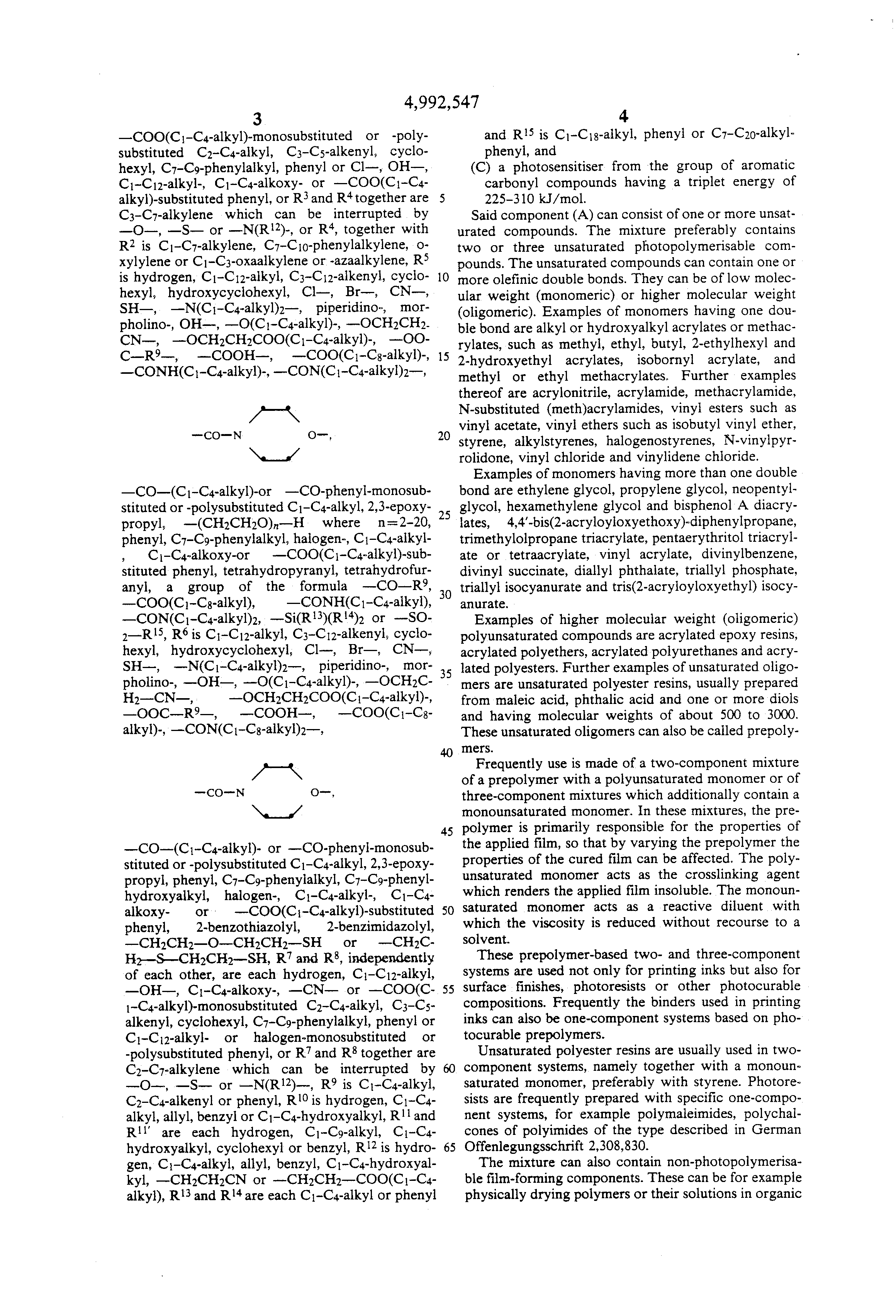Said component (A) can consist of one or more unsaturated compounds. The mixture preferably contains two or three unsaturated photopolymerisable compounds. The unsaturated compounds can contain one or more olefinic double bonds. They can be of low molecular weight (monomeric) or higher molecular weight (oligomeric). Examples of monomers having one double bond are alkyl or hydroxyalkyl acrylates or methacrylates, such as methyl, ethyl, butyl, 2-ethylhexyl and 2-hydroxyethyl acrylates, isobornyl acrylate, and methyl or ethyl methacrylates. Further examples thereof are acrylonitrile, acrylamide, methacrylamide, N-substituted (meth)acrylamides, vinyl esters such as vinyl acetate, vinyl ethers such as isobutyl vinyl ether, styrene, alkylstyrenes, halogenostyrenes, N-vinylpyrrolidone, vinyl chloride and vinylidene chloride.