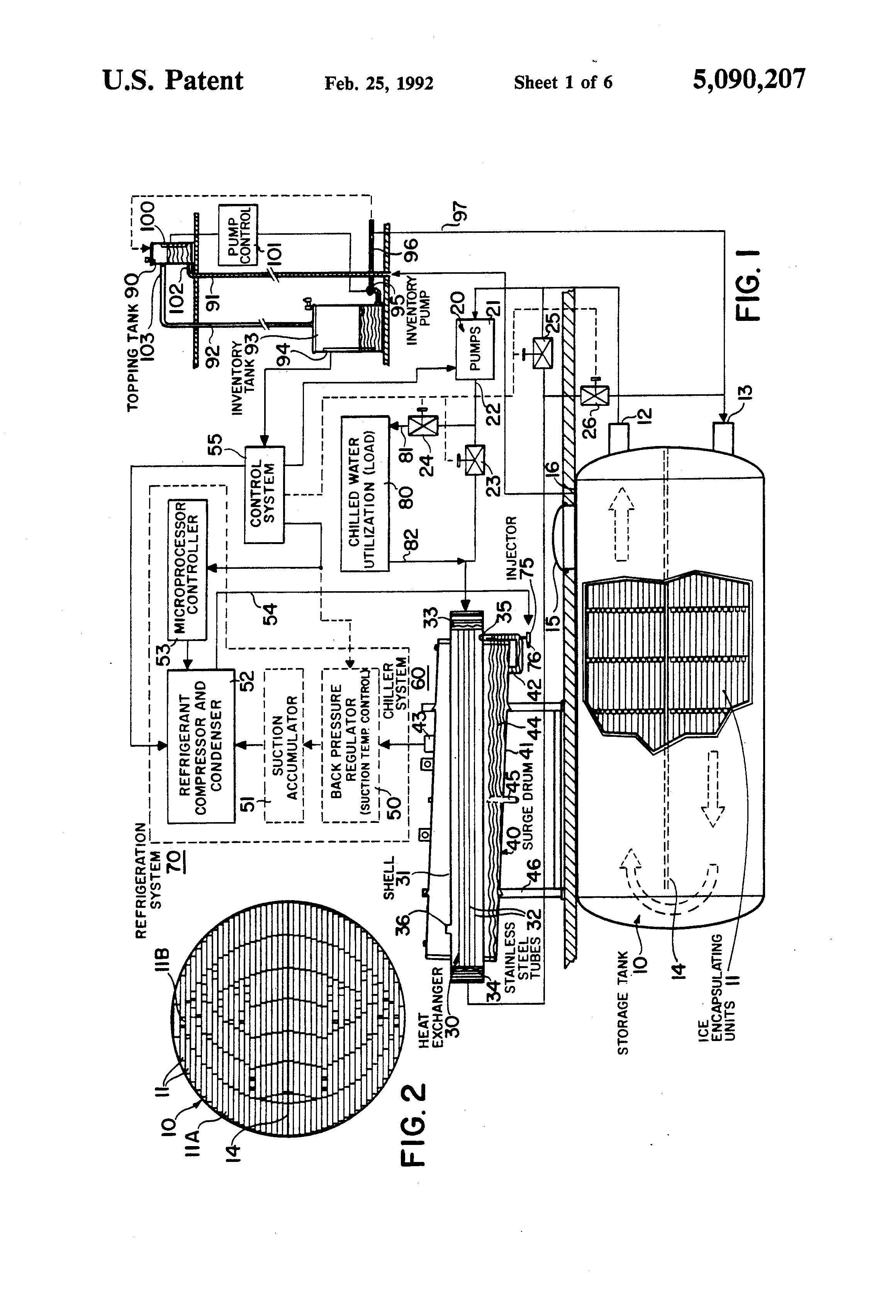 Also, in this adaptation, an inventory tank is mounted at or near grade level and open to the atmosphere with an inlet port at an upper wall portion thereof and an outlet port at a lower wall portion thereof. The inlet port is connected to the outlet port of the topping tank to communicate overflow volumes of the first liquid from the topping tank to the inventory tank. This inventory tank has a volume at least as large as the total volume of liquid displaced from the vessel when the second liquid in the ice encapsulating units is completely frozen.