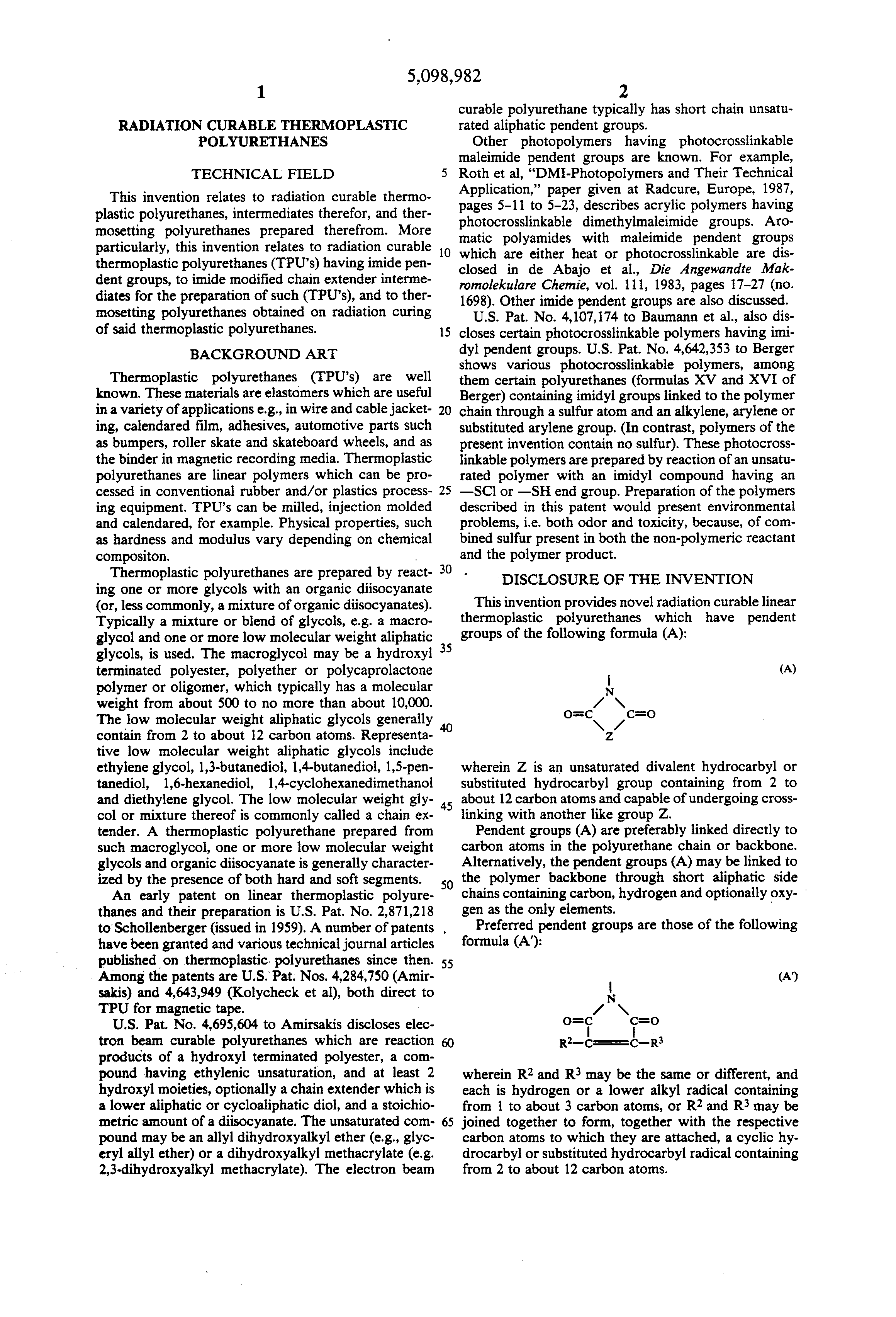 U.S. Pat. No. 4,107,174 to Baumann et al., also discloses certain photocrosslinkable polymers having imidyl pendent groups. U.S. Pat. No. 4,642,353 to Berger shows various photocrosslinkable polymers, among them certain polyurethanes (formulas XV and XVI of Berger) containing imidyl groups linked to the polymer chain through a sulfur atom and an alkylene, arylene or substituted arylene group. (In contrast, polymers of the present invention contain no sulfur). These photocrosslinkable polymers are prepared by reaction of an unsaturated polymer with an imidyl compound having an --SCl or --SH end group. Preparation of the polymers described in this patent would present environmental problems, i.e. both odor and toxicity, because, of combined sulfur present in both the non-polymeric reactant and the polymer product.