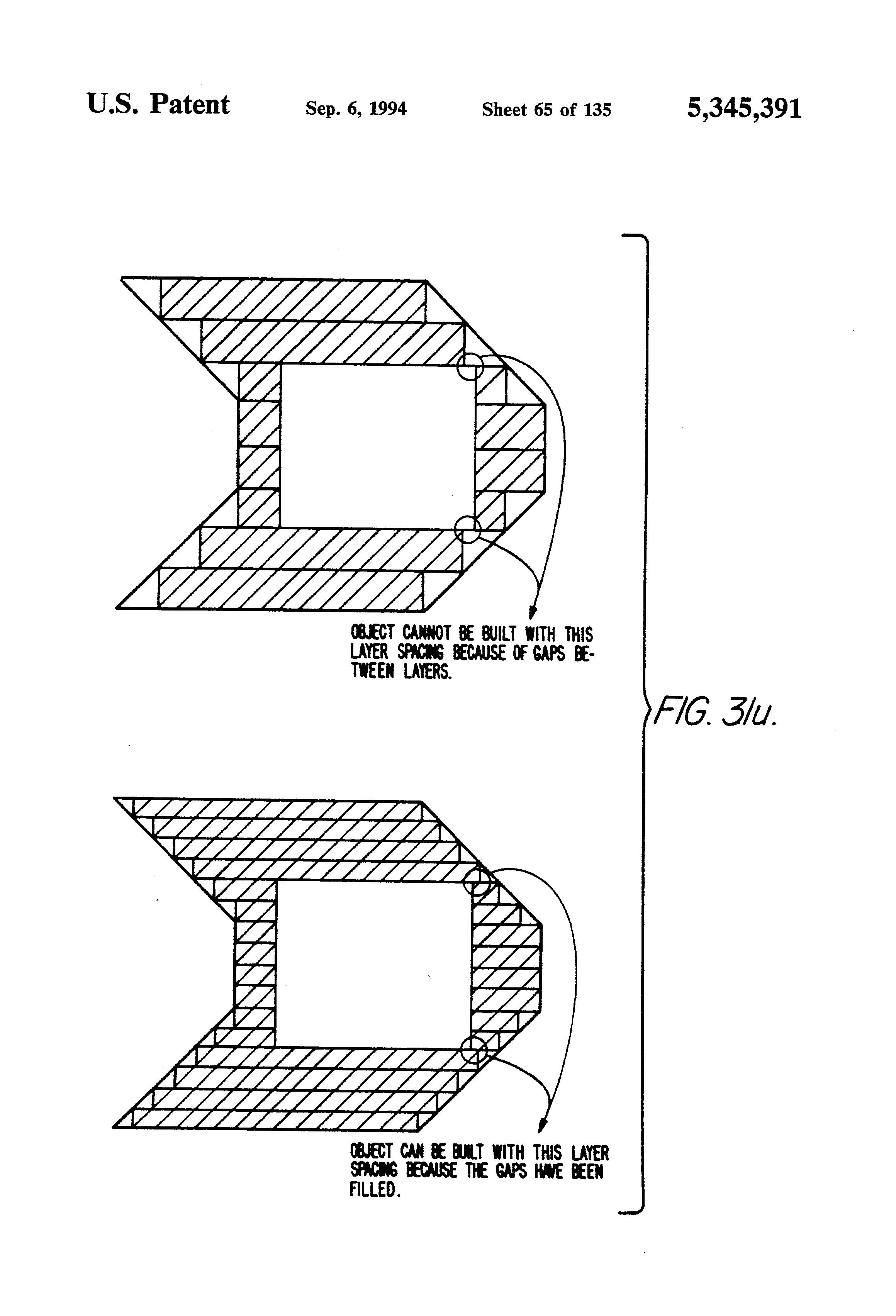 Another approach was based on using inner and outer walls as boundaries for a section of an object, as all real objects have, but the area between these boundaries was not to be completely solidified, but rather crisscrossed by a grid structure known as cross-hatching. This technique provides good structural strength and resolved much of the transition problem. It also reduced the exposure time and distortion problem. However it now created a new potential problem in that, what had originally been a solid object, was now an object with walls but missing top and bottom surfaces.
