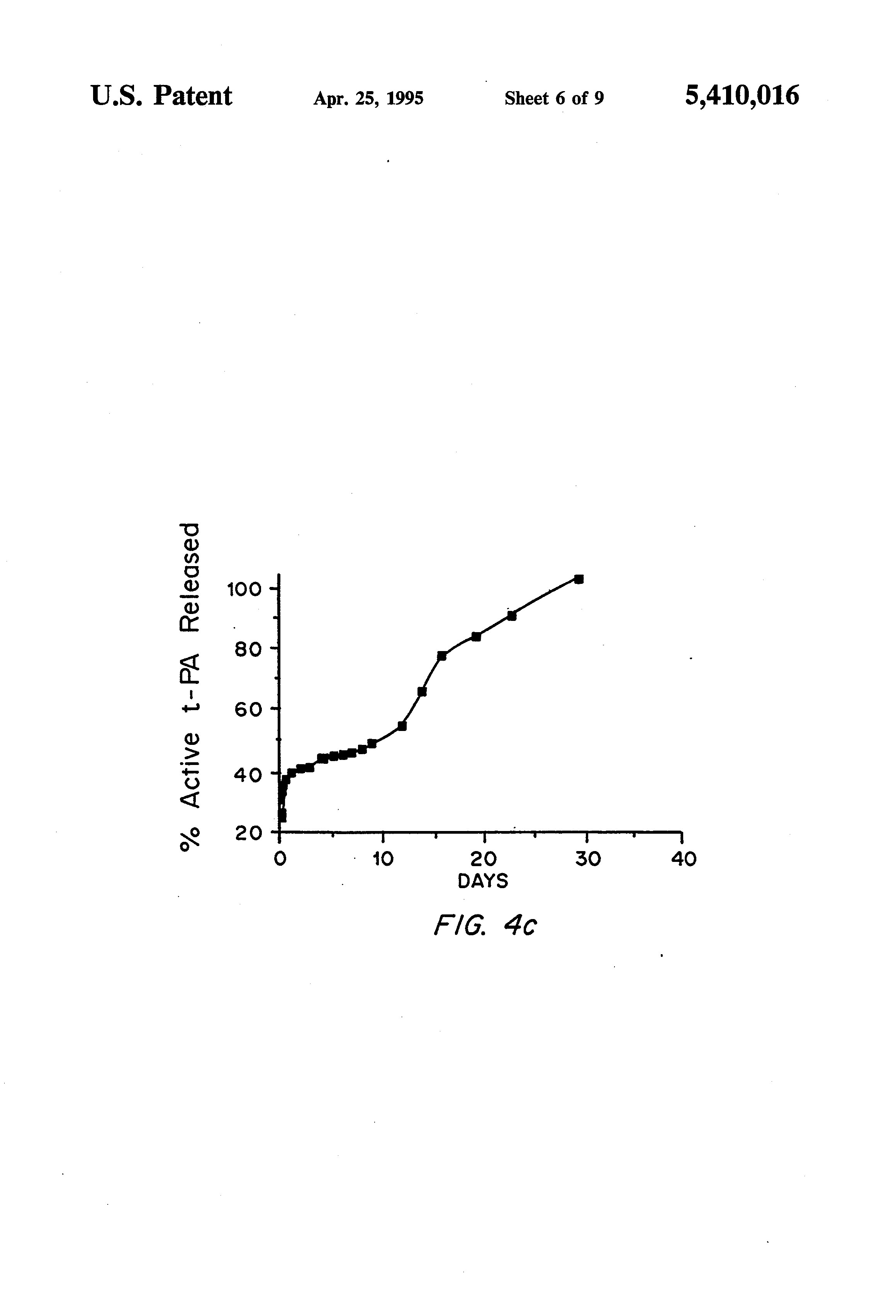FIG. 4C shows release of active recombinant tPA from a PEG 18.5SK-glycolide diacrylate (18.5KG) hydrogel into PBS.
