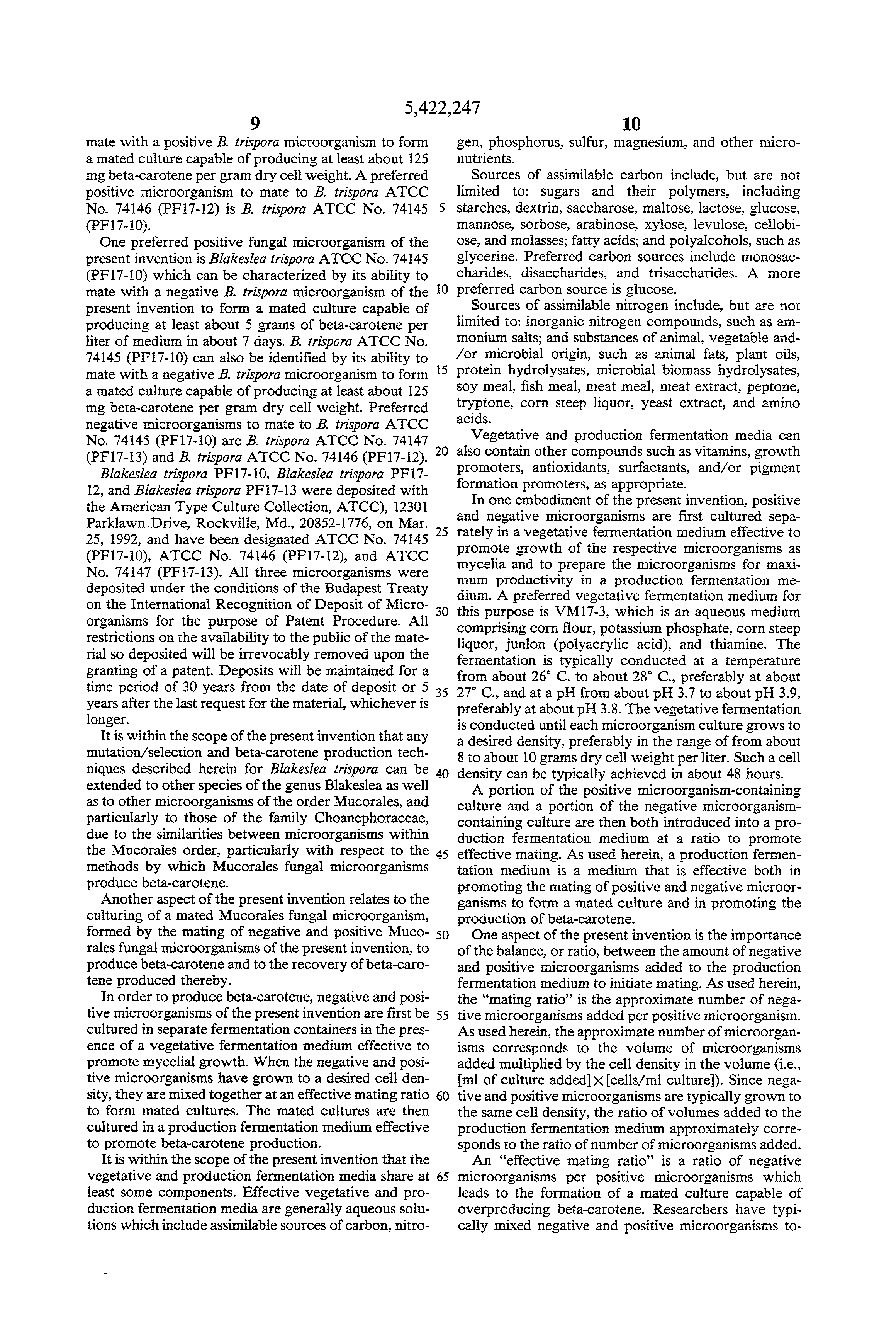 Similarly, preferred positive microorganisms of the present invention comprise positive microorganisms of the genus Blakeslea and mutants thereof, wherein such positive microorganisms or mutants thereof, when mated to negative microorganisms of the present invention, form mated cultures which are capable of producing at least about 2.7 grams of beta-carotene per liter in about 7 days.