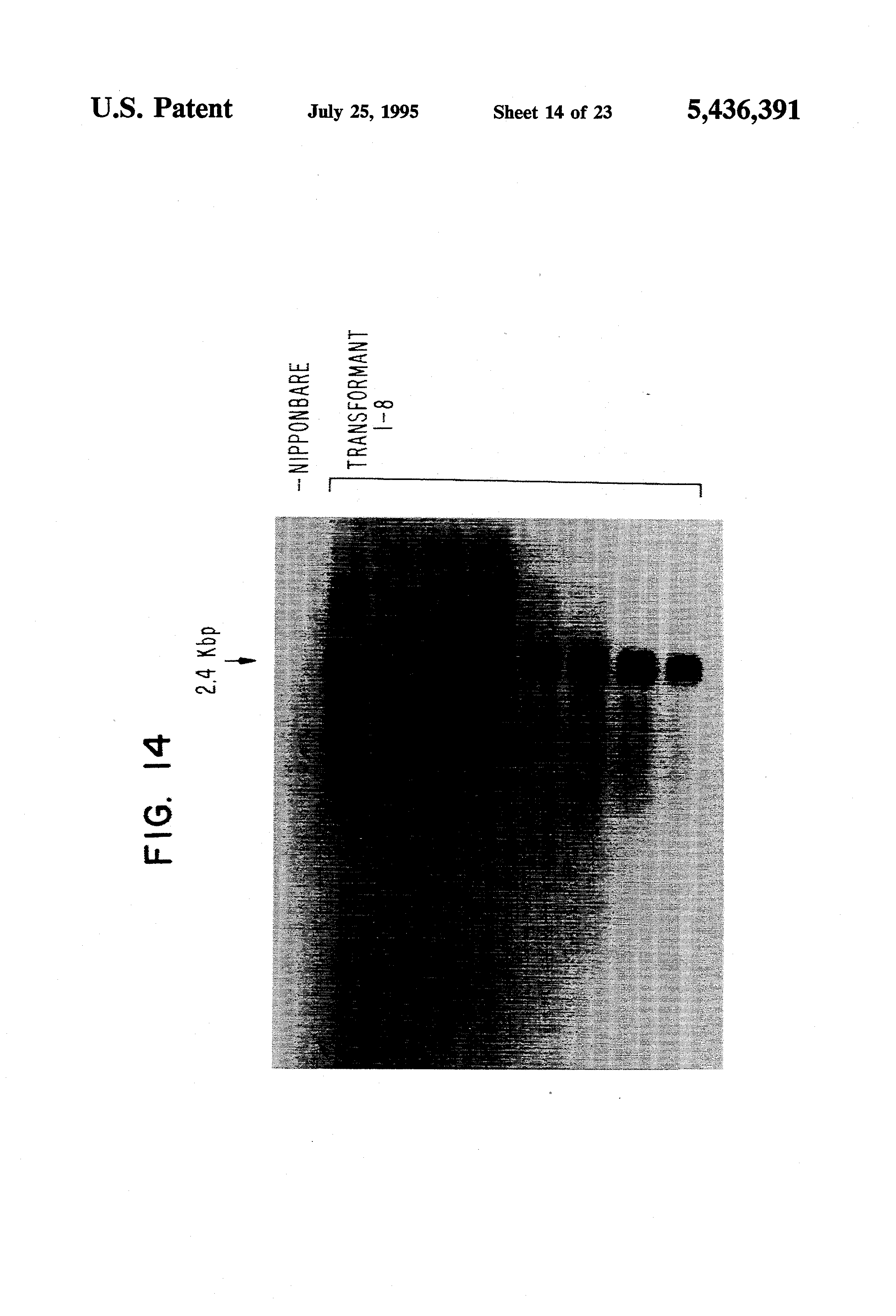 FIG. 13: A migration pattern obtained when the gene used for the transformation was detected by Southern hybridization.